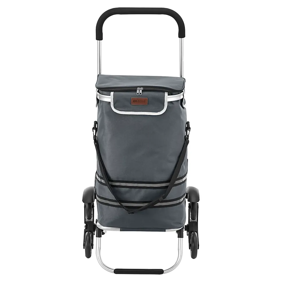 Chariot de coursesPratique et pliable, ce chariot simplifie vos achats au quotidien. Léger avec son châssis en aluminium et sa poignée antidérapante, il assure un transport confortable et sécurisé.Polyvalent, il se transforme en diable gâce à son sac amovible. étanche et équipé d’un filet latéral pour bouteilles, il protège vos courses de la pluie et offre un rangement supplémentaire.Sa conception pliable permet un rangement facile, tandis que les roues en étoile franchissent aisément escaliers et marches. Le sac isotherme intégré garde vos produits au frais, idéal pour les courses, pique-niques et sorties.Alliant fonctionnalité et design ergonomique, ce chariot est un indispensable pour votre ménage.Points forts :- moyen pratique de faire ses courses- sac à provisions amovible avec éléments décoratifs réfléchissants- pliable et peu encombrant- roues avec dispositif anti-éclaboussures – avec sac thermique isolé- peut être utilisé comme diable jusqu’à 20 kg- poignée antidérapante et extensible- capacité 41 litresMatière :- sac : 100% polyester (tissu Oxford 600D)- cadre : aluminium- roues : caoutchouc- poignée : mousseDimensions :- totales (ha x la x pro) : 100 x 45 x 36 cm- sac (ha x la x pro) : 54 x 33 x 23 cm- plié (ha x la x pro) : 48,5 x 45,5 x 16 cm- longueur de la poignée : 34 cm- diamètre des roues : 12 cm chacuneCouleur :gris foncéContenu de la livraison :1 x chariot1 x sacProduit de la marque :[en.casa]