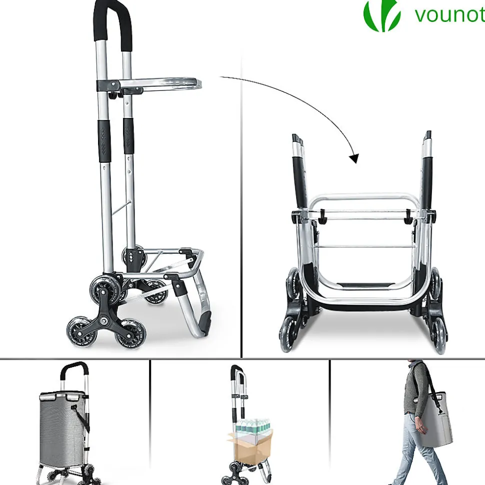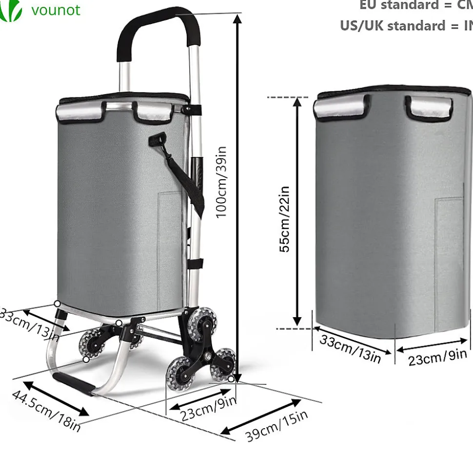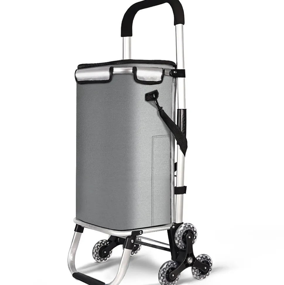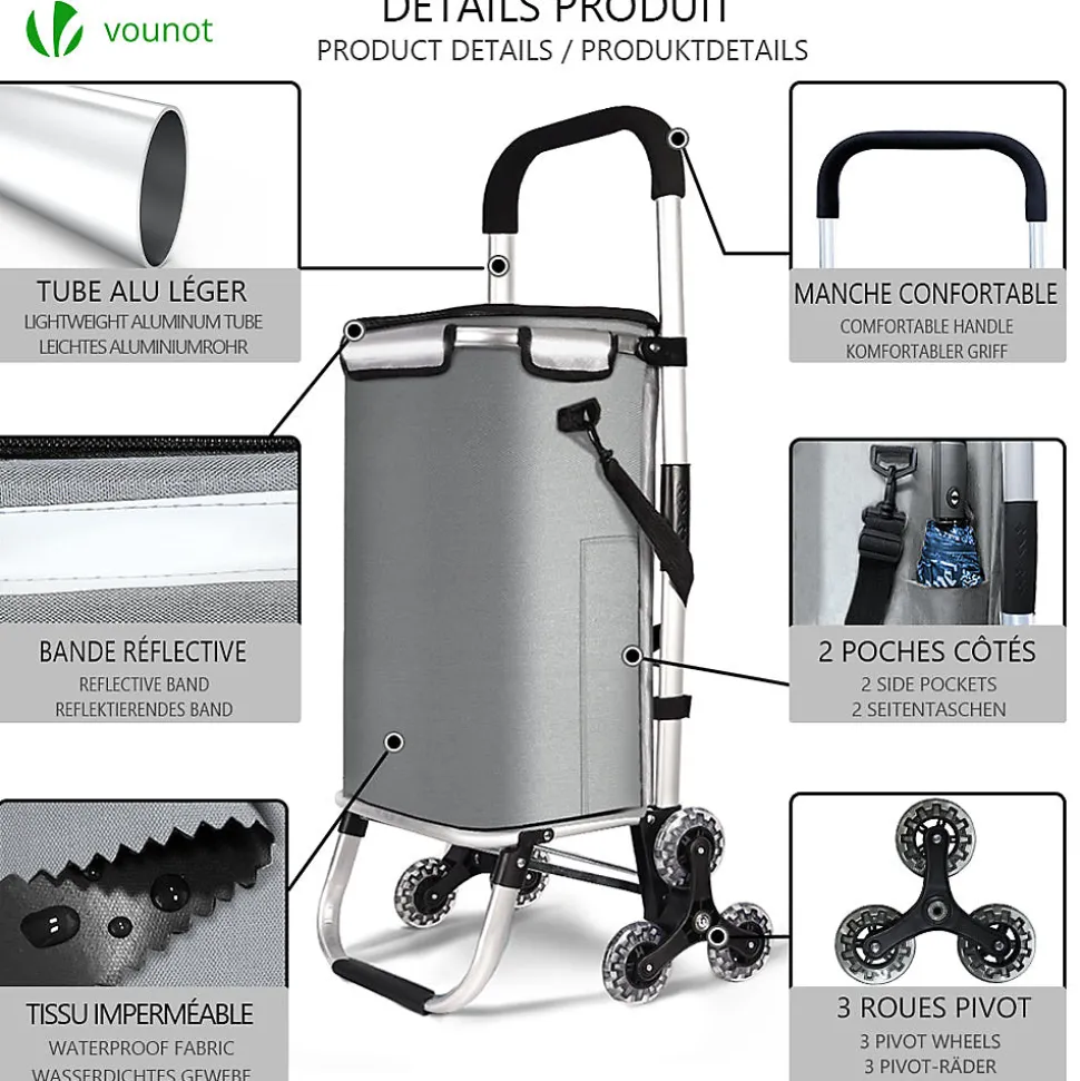 LES + PRODUITS Système de 6 roues monte escalier et trottoir Structure en aluminium robuste Sac imperméable et utilisations multiples Facile à installer et rangerDESCRIPTION Grâce à son système de 6 roues de qualité, vous pourrez aisément monter ou descendre les escaliers sans le moindre effort et profité d’un déplacement silencieux. Facile à ranger avec un cadre en aluminium qui se plie, le chariot prendra une place minimale pour un gain de place optimal. Grâce à son cadre en aluminium, le chariot peut s’utiliser comme un diable. Avec le sac imperméable et sa sangle intégrée, il peut être utilisé comme une sacoche de course. Avec la structure en aluminium robuste, le sac imperméable et le sac isotherme intégré, notre chariot vous permettra de charger jusqu’à 40kg sans problème. La poignée en mousse confortable vous permettra un déplacement du caddie agréable. Les poches de deux cotés et les bandes réflectives sur le sac vous donneront une meilleure expérience de courses.CARACTÉRISTIQUES Dimensions du sac : 33*23*55 cm environ Dimensions du cadre : 44.5*39*100 cm environ Poids : env. 3kg Matériel : Polyester, aluminium Charge Max : 40kg