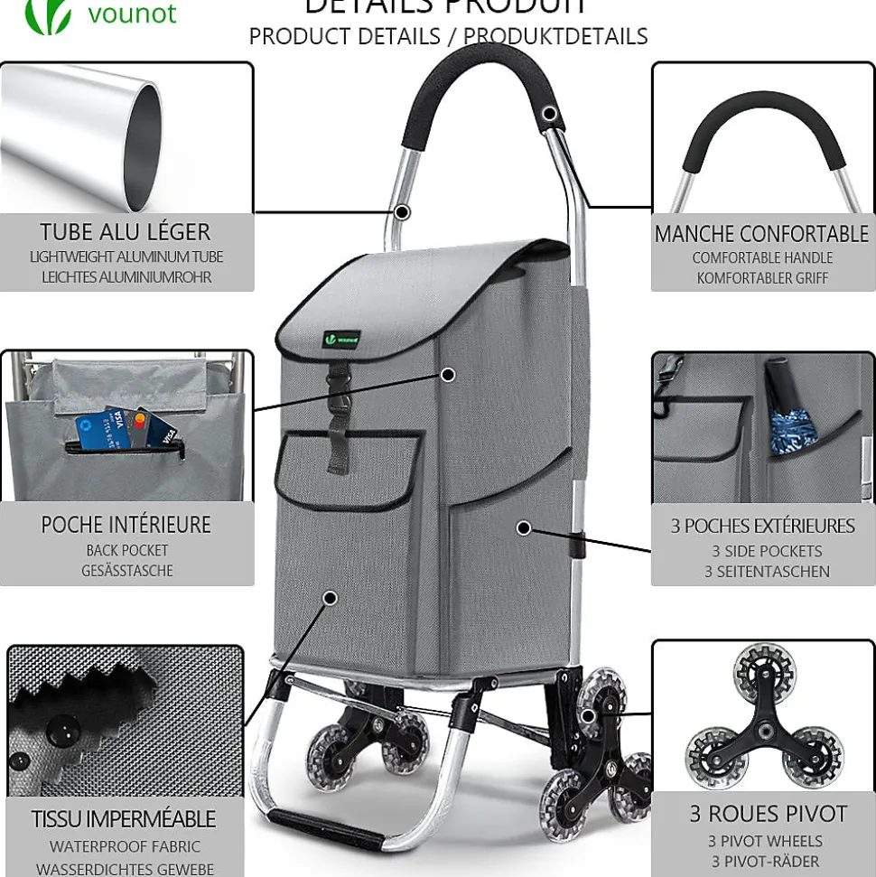 LES + PRODUITS Système de 6 roues monte escalier et trottoir Structure en aluminium léger Sac imperméable et utilisations multiples Facile à installer et rangerDESCRIPTION Grâce à son système de 6 roues de qualité, vous pourrez aisément monter ou descendre les escaliers sans le moindre effort et profiter d’un déplacement silencieux. Facile à ranger avec un cadre en aluminium qui se plie, le chariot prendra une place minimale pour un gain de place optimal. En plus d’être un chariot de course, il peut s’utiliser comme un diable pouvant supporter jusqu’à 40kg de cartons empilés, boîtes ou autres grâce à son cadre aluminium robuste. Avec la structure en aluminium robuste et le sac imperméable, le chariot de course léger qui fournit une durée de vie plus longue contre les intempéries. La poignée en mousse confortable vous permettra un déplacement du caddie agréable. Les poches de deux cotés vous permettront de rajouter un parapluie ou petite gourde.CARACTÉRISTIQUES Dimensions du sac : 33*23*55 cm environ Dimensions du cadre : 45*39*101 cm environ Poids : env. 3kg Matériel : Polyester, aluminium Charge Max : 40kg