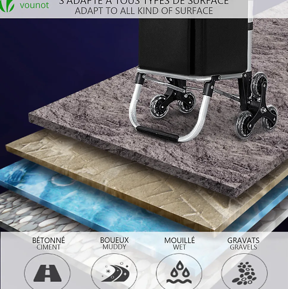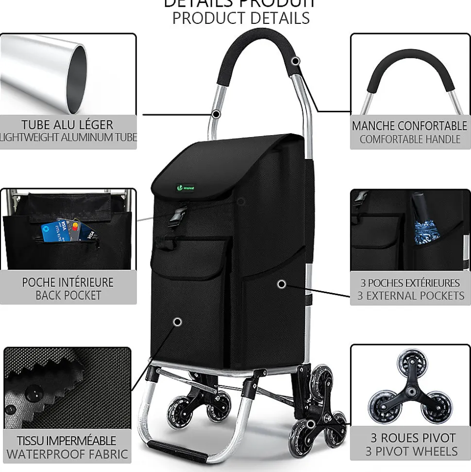 LES + PRODUITS Système de 6 roues monte escalier et trottoir Structure en aluminium léger Sac imperméable et utilisations multiples Facile à installer et rangerPOURQUOI CHOISIR NOTRE PRODUIT ? Grâce à son système de 6 roues de qualité, vous pourrez aisément monter ou descendre les escaliers sans le moindre effort et profiter d’un déplacement silencieux. Facile à ranger avec un cadre en aluminium qui se plie, le chariot prendra une place minimale pour un gain de place optimal. En plus d’être un chariot de course, il peut s’utiliser comme un diable pouvant supporter jusqu’à 40kg de cartons empilés, boîtes ou autres grâce à son cadre aluminium robuste. Avec la structure en aluminium robuste et le sac imperméable, le chariot de course léger qui fournit une durée de vie plus longue contre les intempéries. La poignée en mousse confortable vous permettra un déplacement du caddie agréable. Les poches de deux cotés vous permettront de rajouter un parapluie ou petite gourde.CARACTÉRISTIQUES- Dimensions du sac : 33*23*55 cm environ- Dimensions du cadre : 45*39*101 cm environ- Poids : env. 3kg- Matériel : Polyester, aluminium- Charge Max : 40kgIMPORTANT :Les livraisons se font en France métropolitaine à l’exception des îles qui ne sont pas reliées au continent par un pont (Corse, Ile d’Yeux etc.) et des DOM-TOM.