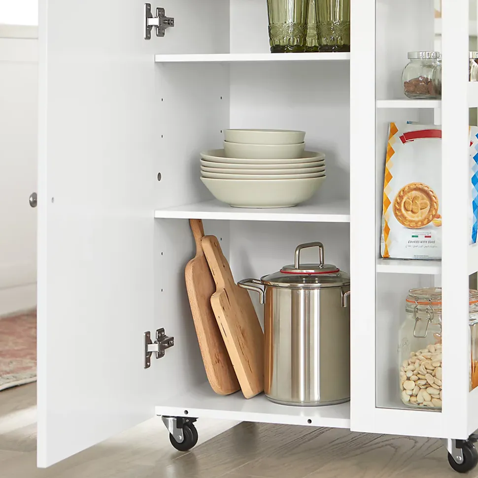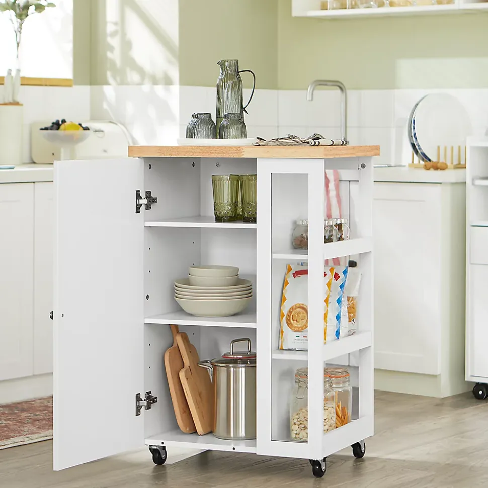 Material: MDF und Glass; Gewicht: ca. 27,5kg, Belastbarkeit: bis 50 kg Produktmaße: BHT ca.: 60x90x40cm (siehe Abbildung); Paketmaße: 88x19x47cm Es verfügt über einen Schrank mit Tür, um Ihre verschiedene Speicherplatzbedarf mit ausreichend Platz zu erfüllen; Die 2 Zwischenböden sind frei justierbar. Dank der 3 offenen Ablagen können Sie Getränke, Tassen und alles, was schnell zur Hand sein soll, abstellen. Neu: Die 3 Ablagefächer können rechts oder links montiert werden. Der Küchenwagen hat vier stabile Gummirollen (2 davon feststellbar), auf denen sich der Küchenwagen leicht auf jeder Oberfläche verschieben lässt. Der Küchenwagen ist immer dort zu Stelle, wo gerade zusätzlicher Platz benötigt wird. Gerade für kleine Küchen ist der Küchenwagen ideal geeignet, um die Arbeitsfläche zu vergrößern und gleichzeitig mehr Stauraum zu generieren. Ausgestattet ist dieser praktische Küchenwagen mit einem geschlossenen Schrank und einem offenen Seitenregal, indem Sie viele Utensilien verstauen können. Die 2 Regalböden des Schranks sind höhenverstellbar. Dank der 4 hochwertigen Räder (zwei mit Stopper) können Sie den Küchenwagen an einem Ort abstellen oder Sie ihn mühelos durch die Wohnung rollen. Dieser Rollwagen erzeugt eine unverwechselbare und moderne Atmosphäre. Durch das schlichte Design macht der Rollwagen überall eine gute Figur und passt zu allen Dekorationsstile.