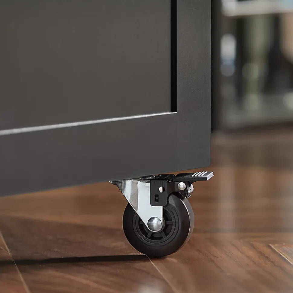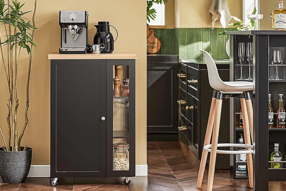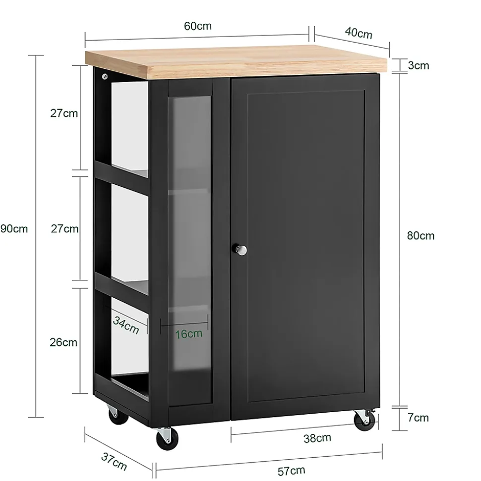 Gewicht: ca. 25kg, Belastbarkeit: bis 75 kg; Material: MDF(E1), Glas; Produktmaße: BHT ca.: 60x90x40cm (Siehe Abbildung); Paketmaße: 90x47x21cm. Es verfügt über einen Schrank mit Tür, um Ihre verschiedene Speicherplatzbedarf mit ausreichend Platz zu erfüllen; Die 2 Zwischenböden sind frei justierbar. Neu: Die 3 Ablagefächer können rechts oder links montiert werden. Dank der 3 offenen Ablagen rechts können Sie Getränke, Tassen und alles, was schnell zur Hand sein soll, abstellen. Der Küchenwagen hat vier stabile Gummirollen (2 davon feststellbar), auf denen sich der Küchenwagen leicht auf jeder Oberfläche verschieben lässt. Produktdetails: – Farbe: Schwarz – Material: MDF(E1) – Produktmaße: BHT ca.: 60x90x40cm – Paketmaße: 90x47x21cm – Gewicht: ca.: 25kg – Belastbarkeit: bis 75kg Lieferumfang: – 1 x Küchenwagen – 1 x Zubehörbeutel – 1 x Anleitung