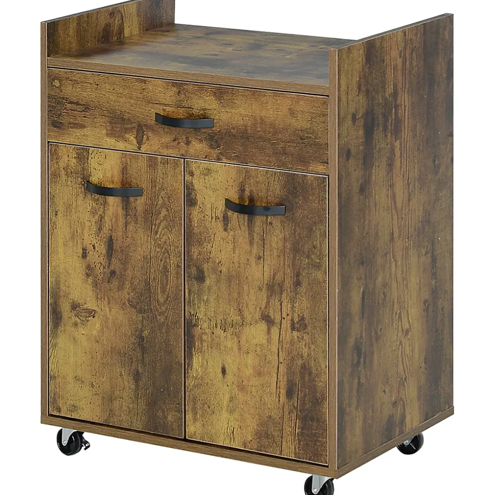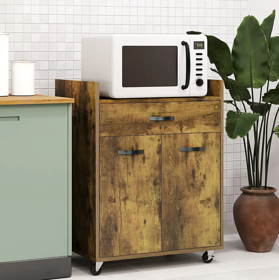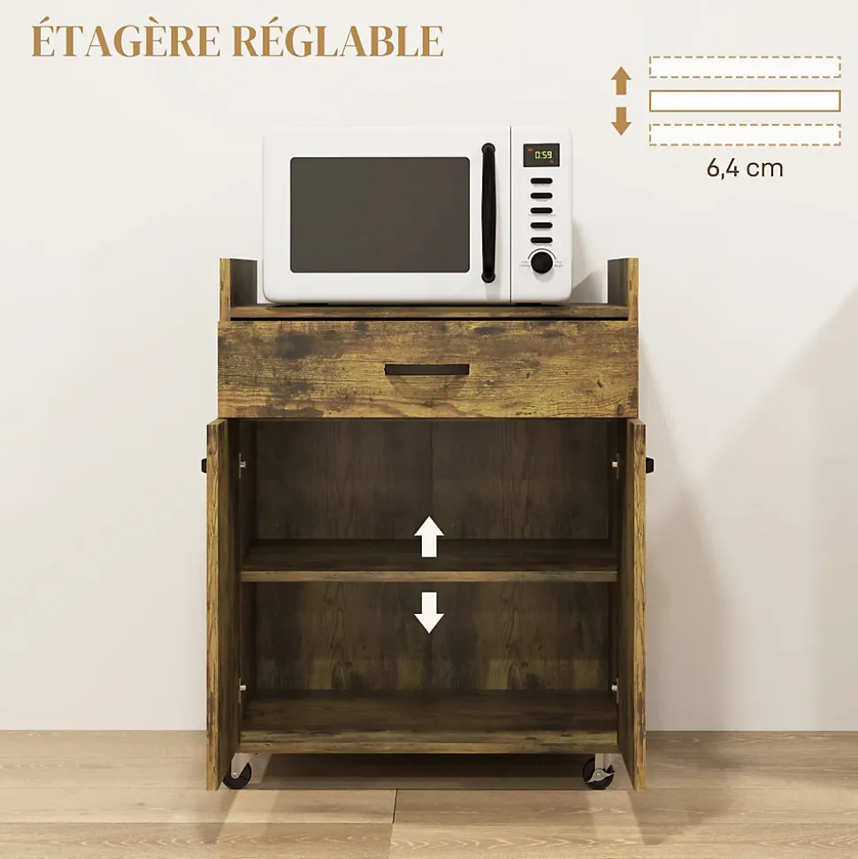 Ce chariot de service de HOMCOM est une option idéale pour garder votre cuisine propre et rangée. Un tiroir et un placard fermé offrent grand espace pour les fournitures et les accessoires. Le dessus de table est assez grand pour mettre un four à micro-ondes. Les roues avec 2 freins facilitent le déplacement. Son style moderne convient à la plupart des meubles de maison.Caractéristiques :- Un tiroir pratique, un placard à double porte et un plateau de table offrent beaucoup de rangement- Tablette réglable intégrée à 3 niveaux pour répondre à vos besoins- 4 roues à roulement doux dont 2 avec freins pour une libre circulation- La taille compacte est flexible pour se déplacer d’une pièce à l’autre- Le bureau avec déflecteur empêche les objets de tomber- Équipé de panneaux de particules pour un nettoyage facile et peu d’entretien- Comprend une conception anti-basculement pour plus de sécurité- Assemblage requisSpécifications :- 3 coloris au choix : blanc, aspect chêne clair ; aspect bois vieilli ; noir, aspect chêne clair- Matériau : panneau de particules- Dim. totales : 60l x 40P x 77H cm- Dim. table : 57l x 40P x 6H cm- Dim. intérieures du tiroir : 51,5l x 28,5P x 8H cm- Dim. porte : 28L x 47,5H cm- Dim. intérieures du placard (étagère au milieu) : 56,5l x 36P x 22H cm (haut), 56,5l x 36P x 23,5H cm (bas)- Charge max. recommandée : 40 kg (au total), 3 kg (tiroir), 5 kg (étagère)- Réf. : 801-209/209V80RB/209V80BK