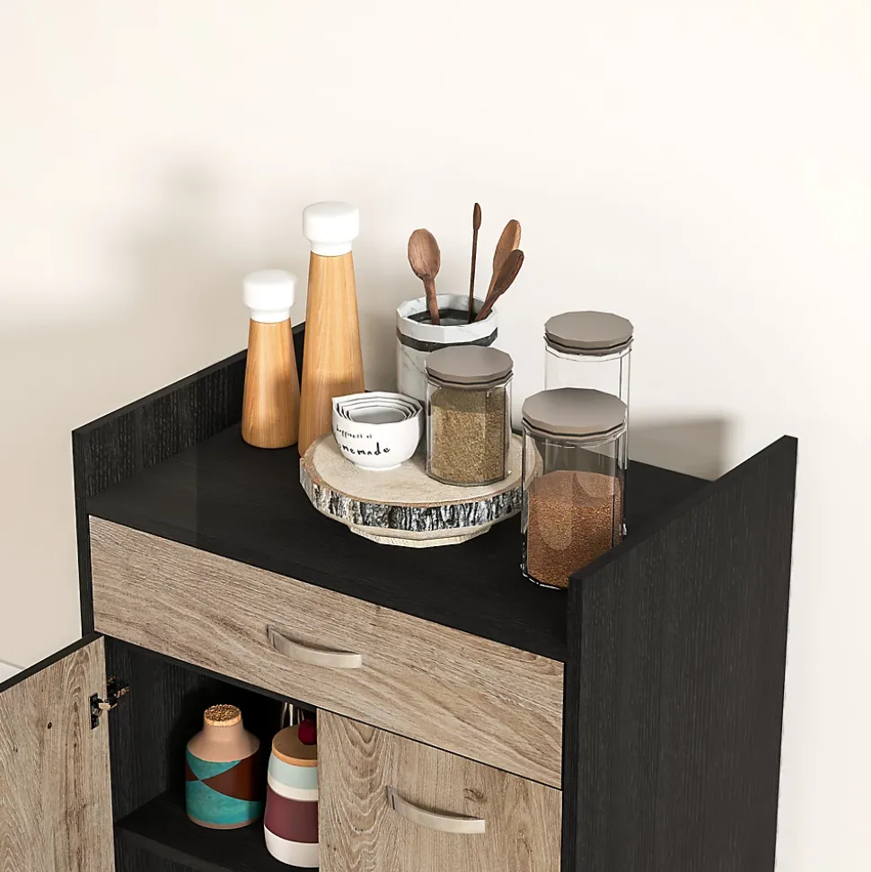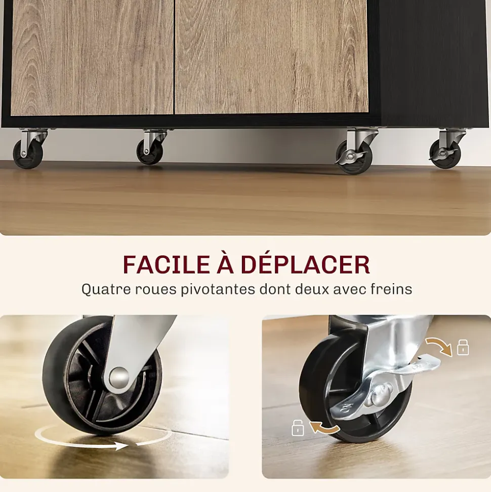 Ce chariot de service de HOMCOM est une option idéale pour garder votre cuisine propre et rangée. Un tiroir et un placard fermé offrent grand espace pour les fournitures et les accessoires. Le dessus de table est assez grand pour mettre un four à micro-ondes. Les roues avec 2 freins facilitent le déplacement. Son style moderne convient à la plupart des meubles de maison.Caractéristiques :- Un tiroir pratique, un placard à double porte et un plateau de table offrent beaucoup de rangement- Tablette réglable intégrée à 3 niveaux pour répondre à vos besoins- 4 roues à roulement doux dont 2 avec freins pour une libre circulation- La taille compacte est flexible pour se déplacer d’une pièce à l’autre- Le bureau avec déflecteur empêche les objets de tomber- Équipé de panneaux de particules pour un nettoyage facile et peu d’entretien- Comprend une conception anti-basculement pour plus de sécurité- Assemblage requisSpécifications :- 3 coloris au choix : blanc, aspect chêne clair ; aspect bois vieilli ; noir, aspect chêne clair- Matériau : panneau de particules- Dim. totales : 60l x 40P x 77H cm- Dim. table : 57l x 40P x 6H cm- Dim. intérieures du tiroir : 51,5l x 28,5P x 8H cm- Dim. porte : 28L x 47,5H cm- Dim. intérieures du placard (étagère au milieu) : 56,5l x 36P x 22H cm (haut), 56,5l x 36P x 23,5H cm (bas)- Charge max. recommandée : 40 kg (au total), 3 kg (tiroir), 5 kg (étagère)- Réf. : 801-209/209V80RB/209V80BK