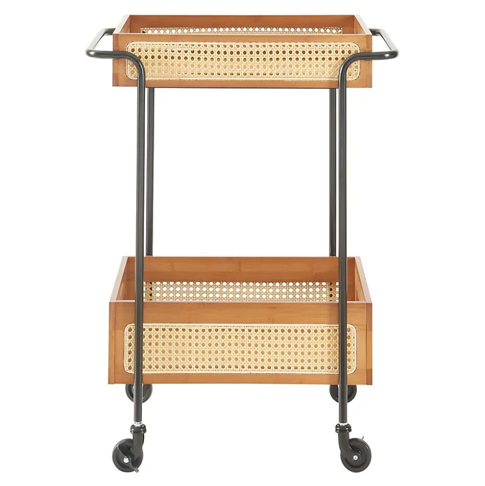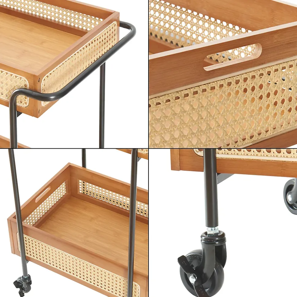 Chariot de serviceCe chariot de service pratique est le complément parfait pour votre maison ou lieu de travail. Doté de 4 roulettes maniables, il se déplace facilement, offrant ainsi une grande flexibilité d’utilisation dans divers espaces.Ses 2 corbeilles de rangement décoratives fournissent un espace généreux pour la vaisselle, les boisson et les snacks.Polyvalent, il ne se limite pas à la cuisine : il trouve également sa place dans la salle de bain, où il offre un rangement pratique pour les produits de soin et accessoires. Au bureau, il devient un allié utile pour transporter fournitures ou dossiers.Avec son design intemporel, ce chariot s’intègre harmonieusement dans tout type d’intérieur, apportant une touche d’élégance à votre espace.Points forts :- desserte élégante pour la maison ou le bureau- 2 paniers décoratifs- freins d’arrêt pour une bonne stabilité- pratique pour servir les aliments et les boissons- organise les ustensiles et les fournitures de bureau- s’intègre dans différents styles d’aménagement- montage rapide et facileMatière :- cadre : métal- bordure du panier : bambou avec tressage plastique- tablette : MDFDimensions :- totales (ha x la x pro) : 80,5 x 61 x 39 cm- plateau de rangement (l x p) : 48 x 33 cm chacun- hauteur de la corbeille supérieure : 10 cm- hauteur du panier inférieur : 15 cm- distance du sol au panier inférieur : 15 cmCouleur :- cadre : noir- paniers : effet bois + aspect rotinContenu de la livraison :1 x desserteProduit de la marque :[en.casa]
