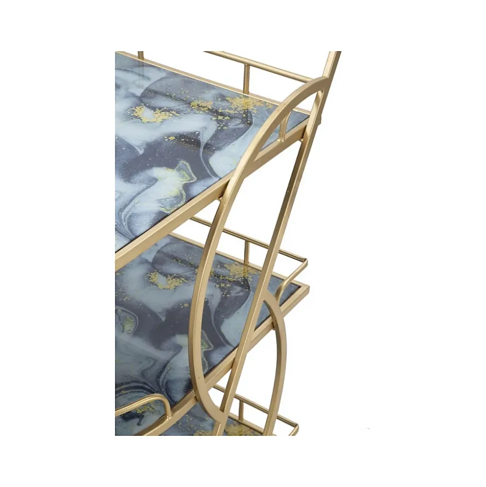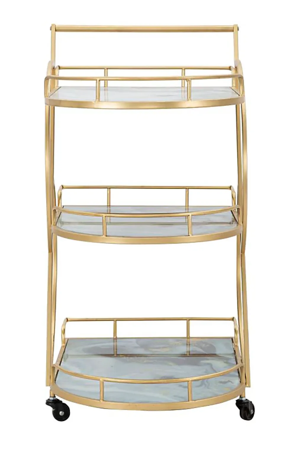Chariot de restauration avec structure en métal doré avec 3 étagères en verre réalisées avec un travail imitant le marbre. Le dessin géométrique composé de 2 demi-cercles et le contraste des couleurs donnent une touche d’élégance
