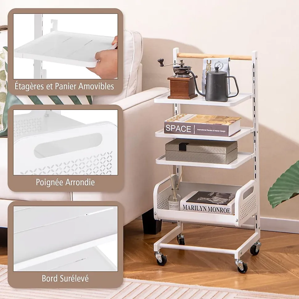 Notre chariot roulant à 4 niveaux est conçu pour améliorer la fonctionnalité de n’importe quel espace. Polyvalent, il dispose de 4 niveaux de rangement, dont 3 étagères supérieures robustes et un panier inférieur en maille métallique, offrant un rangement spacieux. Avec 20 positions de fentes, il permet des ajustements par incréments de 3,5 cm, adaptées pour accueillir des articles de différentes tailles. Doté de roulettes verrouillables et d’une poignée en bois d’hévéa, il vous permet de le déplacer facilement dans la salle à manger, le salon ou la cuisine.