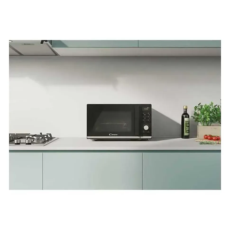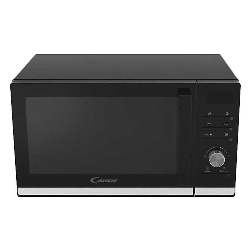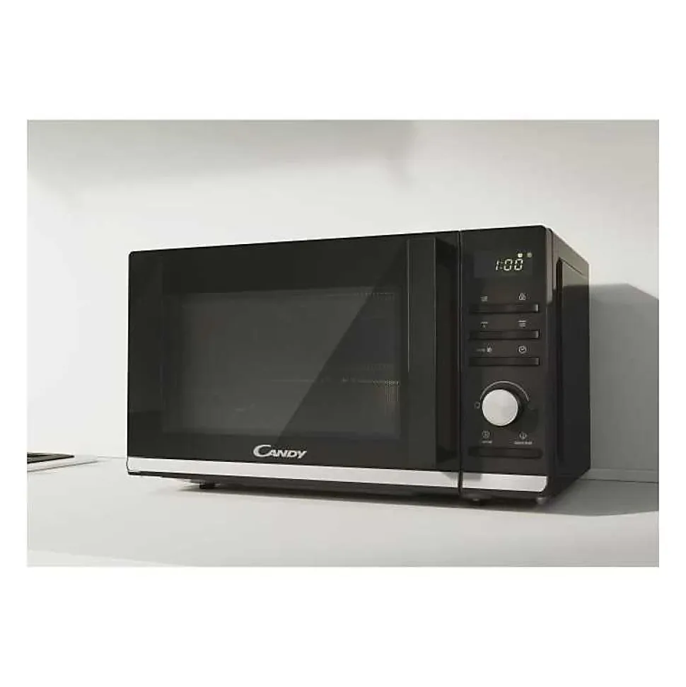 Micro-ondes combiné Candy Moderna 20 L, 700 W micro-ondes + 1000 W grill, 19 programmes automatiques, affichage LED, porte à grande fenêtre, finition noire brillante avec accents inox, conçu pour pose sur comptoir.