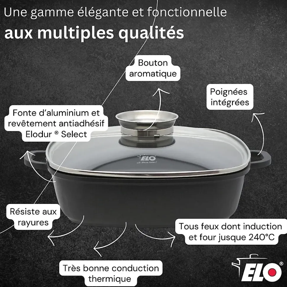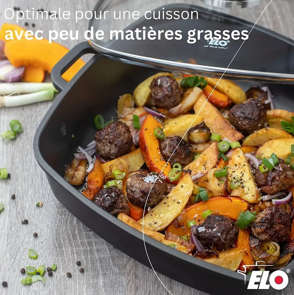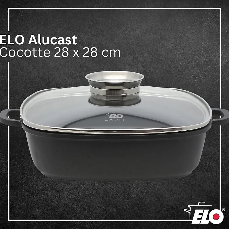 - DESCRIPTION: Cocotte Elo Alucast carrée 28 cm ; 3,6 litres pour 5 personnes, en fonte d’aluminium moulée légère, avec revêtement antiadhésif ELODUR Select
