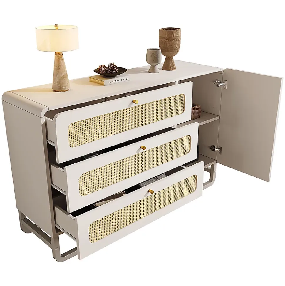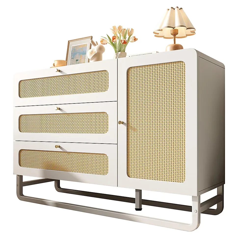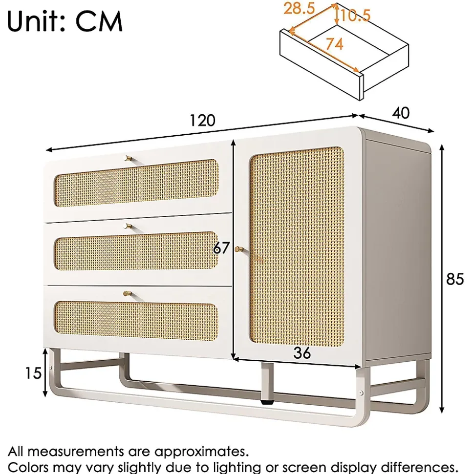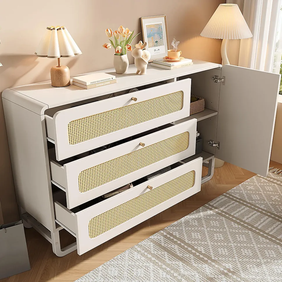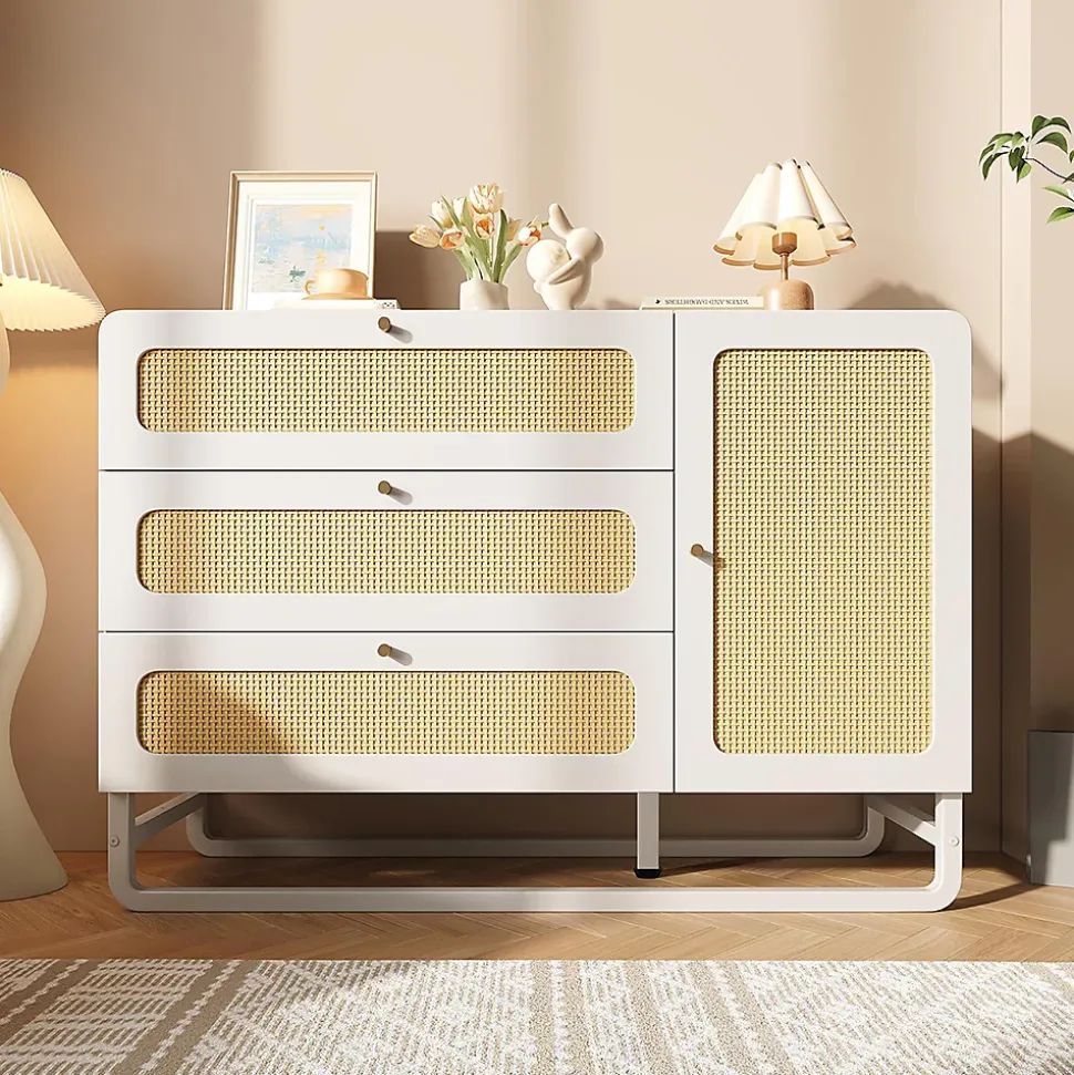 - 【Style cottage naturel et design incurvé】Cette commode est fabriquée à partir de panneaux de bois de haute qualité avec une finition blanche. Les tiroirs et les portes sont décorés de rotin jaune et de poignées métalliques dorées, ce qui crée une palette de couleurs claires et un style cottage chaleureux. La combinaison parfaite entre décoration et espace de rangement complète le style décoratif de n’importe quelle pièce.