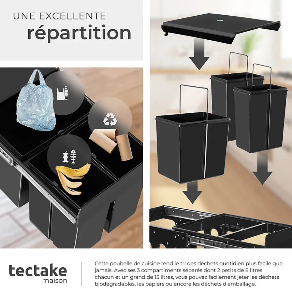 Une aide idéale pour votre cuisine Une gestion optimale des déchets commence par un système adapté, et la poubelle de tri Ashlyn de tectake répond parfaitement à ce besoin. Dotée de 3 conteneurs séparés elle facilite la distinction entre les déchets organiques, résiduels, papier ou autres, c’est une solution idéale pour une gestion durable et pratique au quotidien. Une utilisation pratique Le système se distingue par ses rails télescopiques ergonomiques, garantissant une extraction fluide et silencieuse des différents compartiments. Chaque bac est facilement accessible, simplifiant grandement le tri et l’élimination des déchets. Conçu pour s’intégrer dans des placards d’au moins 40 cm de largeurce collecteur optimise l’espace tout en restant discret et fonctionnel. Robuste et facile d’entretien Fabriquée en plastique ABS et PP solide, la poubelle de tri de déchets se caractérise par sa stabilité et sa durabilité. Ce matériau hautement résistant supporte sans effort les usages intensifs du quotidien. En plus d’être durable il est facile à nettoyer, offrant un entretien rapide et garantissant une hygiène impeccable dans la cuisine. Un tri des déchets simplifié La poubelle de tri de déchets Ashlyn de tectake combine un design compact et une grande fonctionnalité. Même dans les petits placards elle trouve sa place et transforme le tri des déchets en une tâche simple et rapide. Un complément essentiel pour une cuisine moderne, organisée et durable.