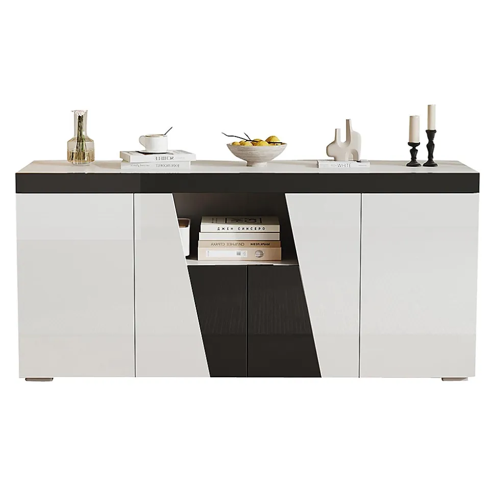 - Conception des portes : quatre portes, dont les deux portes centrales présentent un design en diagonale et une palette de couleurs noir et blanc, se démarquant ainsi de la monotonie des armoires traditionnelles. Le design est à la fois simple et raffiné, faisant de cette armoire un élément attrayant qui attire le regard dans le salon.