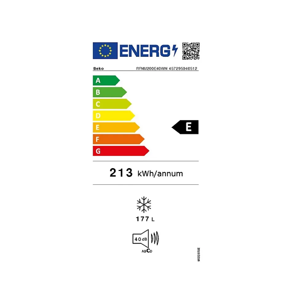 Congélateur armoire 54cm 177l no frost Beko – Ce congélateur armoire RFNM200E40WN de Beko répond à vos contraintes d’espace et s’installe facilement dans des petites pièces avec sa largeur de 54 cm. Avec le froid ventilé No Frost, plus de formation de givre dans le congélateur. Sachant que 0,5 cm de givre induit une surconsommation d’environ 30%. L’écran tactile situé sur le bandeau donne facilement accès au réglage de la température et des options comme le mode Eco ou la congélation rapide. Si la porte est ouverte, une alarme sonore se déclenche. Grâce à une électronique et à un compresseur spécifique, ce congélateur est conçu pour fonctionner à une température ambiante atteignant jusqu’à -15°C. Idéal pour les pièces non chauffées ! Grâce à l’ouverture de porte sans débord, installez où bon vous semble votre appareil: contre un mur ou à côté d’un meuble, l’ouverture n’est plus gênée. – Type de produit : Congélateur armoire.Type de construction : Pose libre.IEE : 100.Volume total (L) : 177.Classe d’efficacité énergétique : E.Emissions de bruit acoustique dans l’air (dB(A)) : 40.Classe d’émission de bruit acoustique dans l’air : C.Conso. d’énergie annuelle (kWh/an) : 213.Classe climatique : SN-T. Cet appareil est conçu pour être utilisé à une température ambiante comprise entre 10°C et 43°C.Réglage hiver : Non.T°C recommandée pour stockage optimisé des denrées alimentaires dans compartiment 4 étoiles (°C) : -18.Mode de dégivrage : Automatique.Pouvoir de congélation spécifique (kg/24h) : 12.Dispositif de congélation rapide : Oui.Type de dégivrage : Automatique.Type de froid du congélateur : Ventilé (No frost).Connecté : Non.Régulation de le température : Electronique.Autonomie en h (durée de montée en température) : 9.Le(s) plus-produit(s) : Ouverture de porte sans débord.Super Congélation / Congélation rapide : Oui.Alarme porte ouverte : Oui.Fabrique de