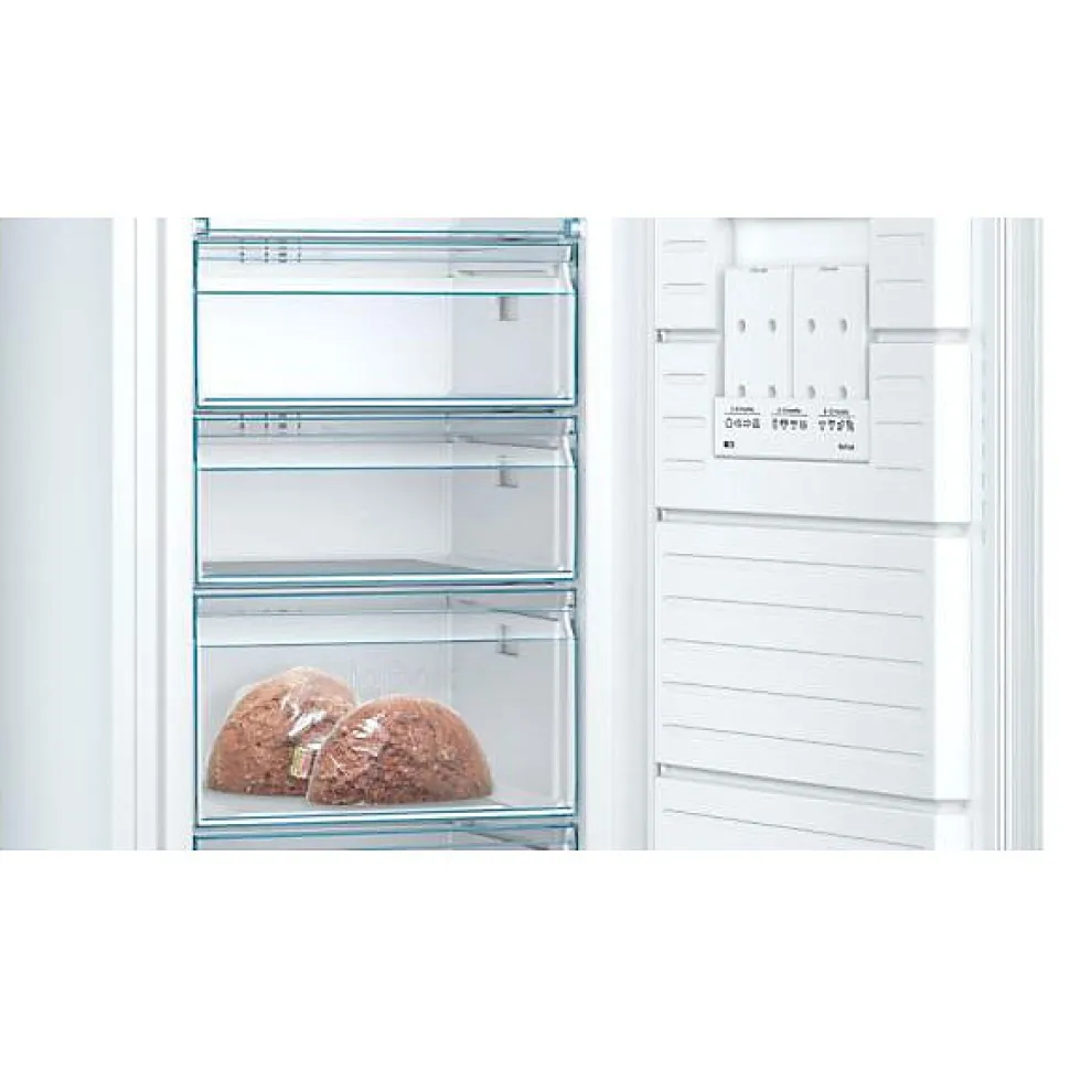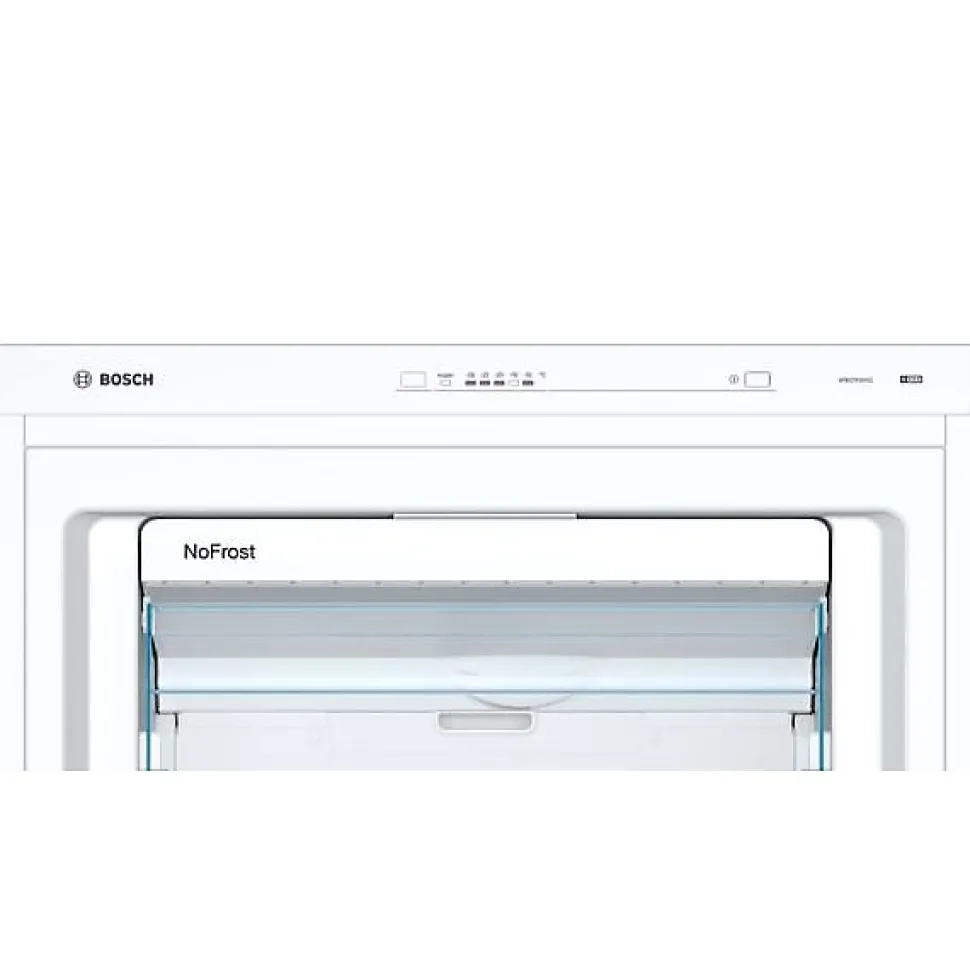 BOSCH – Congélateur armoire No Frost pose-libre – SER4 – Classe E – Consommation électrique/an (kWh)304 – Classe climatique: SN-T – Niveau sonore (dB) 39 – Volume utile total (L): 365 – Volume utile p artie réfrigérateur (L): 0 – Volume utile partie congélateur (L): 365 l – Full no frost – Couleur de la porte: Blanc – H: 191,0 x L: 70,0 x P: 78,0