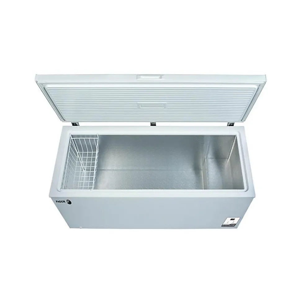 Le congélateur coffre FAGOR FCC500E vous offre un grand volume de 500 litres permettant un rangement optimal avec ses 3 paniers amovibles. Il bénéficie d’une régulation électronique de la température très précise (-24°C à -12°C) et d’un système de froid statique garantissant une conservation homogène de vos aliments. Compact et fonctionnel, il dispose de roulettes multidirectionnelles pour faciliter sa mobilité, d’une porte relevable avec poignée et serrure intégrée, ainsi que d’un panneau de commande verrouillable pour protéger les réglages. Sa structure renforcée assure une isolation thermique optimale et un entretien simple. Classe énergétique E et éclairage LED complètent ses performances.