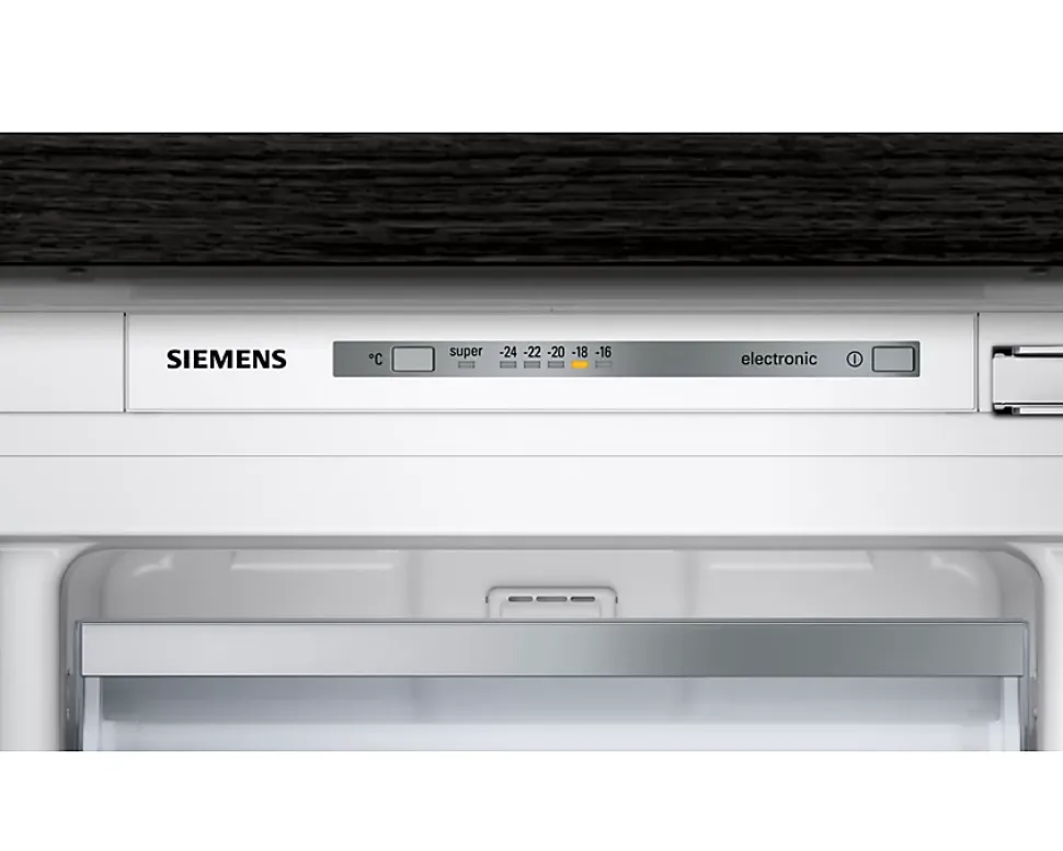 Congélateur intégrable à pantographe 96 l Siemens – Congélateur intégrable iQ500 Siemens GI21VADE0.Un appareil tapissé de givre et de glace consomme plus d’énergie : grâce à la technologie lowFrost l?évaporateur étant directement moulé dans la cuve, l?accumulation de glace est moindre. Non seulement la formation de glace est sensiblement plus faible et plus homogène, mais le dégivrage lui-même est beaucoup plus rapide que sur les appareils traditionnels.Qui n’a pas déjà mal refermé la porte du réfrigérateur ou du congélateur. Heureusement, le système de fermeture douce assistée softPull veille à la bonne fermeture de la porte. Un amortisseur est en outre intégré dans toutes les charnières plates. Ainsi, même si l?habillage de la porte est très lourd, elle se refermera facilement et sûrement pendant toute la durée de vie de l’appareil. – Type de produit : Congélateur intégrable.Volume total : 96 l.Classe d’efficacité énergétique : E.Consommation énergétique : 176 kWh/an.Technologie lowFrost – moins de glace, dégivrage rapide.Fixation de porte à pantographe.Régulation électronique avec affichage LED de la température.Super-congélation avec arrêt automatique.FreshSense : température constante par technologie de capteurs intelligents.Alarme sonore de température, Alarme visuelle.Autonomie en cas de coupure électrique : 13 h.3 tiroirs de congélation transparents, dont 1 bigBox.Pouvoir de congélation en 24h : 5 kg.Puissance de raccordement (W) : 90.Classe climatique : SN-T.Niveau sonore : 36 DB.Classe d’efficacité sonore : Classe sonore_Eu19: C.Charnières à droite, réversibles.Type d’installation : App. encastrable, intégrable.Type de commandes : Electronique.Puissance de raccordement (W) : 90.Longueur du cordon électrique (cm) : 230.Intensité (A) : 10.Fréquence (Hz) : 50.Tension (V) : 220-240.Largeur appareil (mm) : 558.Hauteur appareil