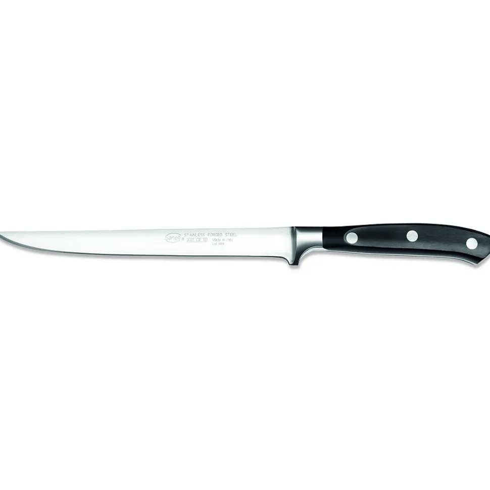 Couteau à lame flexible, pour fileter les poissons de petite et moyenne taille (par ex. perche, truite, sole). La lame fine et flexible en acier inoxydable permet de réaliser des coupes d’une extrême précision. Les couteaux de la ligne Ergoforge sont forgés individuellement en une seule pièce. Manche en résine acétal avec rivets en acier inoxydable. Entièrement fabriqué à la main.. Ce couteau est l’outil le plus utilisé dans la cuisine en raison de son incroyable polyvalence. Qu’il s’agisse de trancher une viande fine ou de découper des légumes en cubes parfaits, sa lame large et tranchante est prête à relever tous les défis culinaires. Forgée en acier, elle offre une dureté exceptionnelle qui garantit une coupe précise et durable. Le manche ajoute une touche d’élégance à votre ustensile, mais offre également une prise en main ergonomique et confortable, garantissant un équilibre et un contrôle supérieurs lors de la découpe. | Collection: Ergoforge 1 | Couleur: Noir | Matériel: Acier Inoxydable, POM-C | Ensemble: 1 | Dimensions du Produit: L2,3xP6xA40 cm | Poids du Produit (Kg): 0,20 | Poids Supporté (Kg): – | Dimensions de Boîtes: W2,3xD6xH40 cm | Poids de Boîtes (Kg): 0,22 | Nombres de Boîtes: 1
