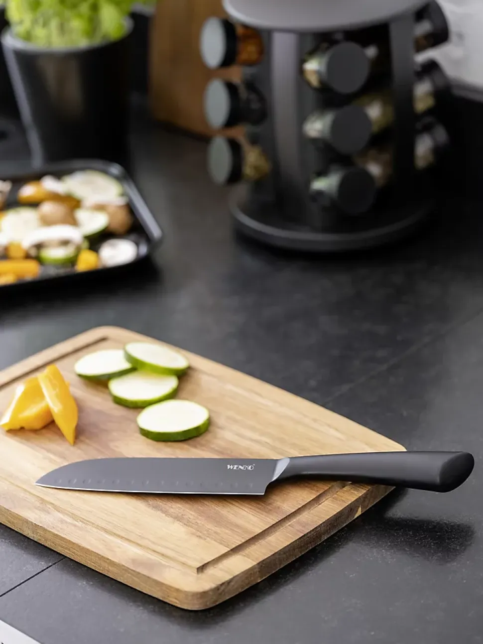 - Couteau santoku élégant en noir avec poignée ergonomique