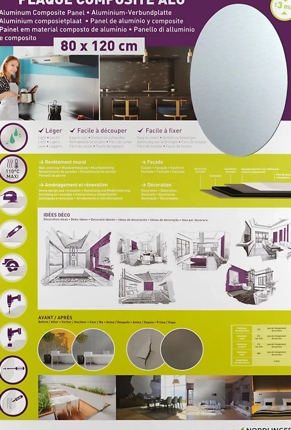 Idéales pour l’aménagement et la rénovation, la décoration, en revêtement mural, les plaques composites s’utilisent en intérieur pour la création de nombreux aménagement intérieur : crédences de cuisine, crédences de salle de bains pour vasque, douche et baignoires, contremarches, revêtements décoratifs et design en intérieur… Facilement positionnable en la vissant ou en la collant, cette crédence aluminium vous permet une excellente protection et bénéficient d’une longue durée de vie.