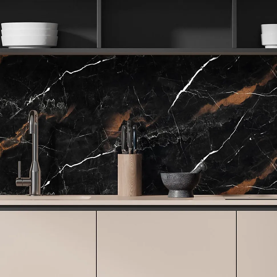 Cette crédence adhésive reproduit le marbre Portoro de Ligurie, noir profond aux veines dorées et blanches spectaculaires. Fabriquée en vinyle double couche, imperméable et résistante, livrée en rouleau, elle est facile à poser et offre un très beau rendu. Son motif est raccordable en largeur et en hauteur pour couvrir si besoin de grandes surfaces. L’entretien est facile. La crédence peut également être utilisée pour relooker vos meubles !