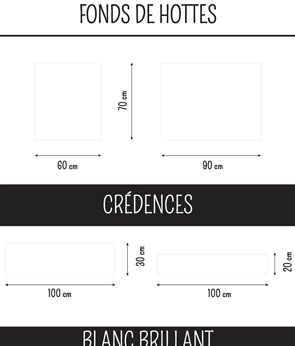 Un Style sobre pour cette crédence prête à poser BLANCHE BRILLANT, idéale pour s’harmoniser avec une cuisine en bois ou une cuisine colorée.Couleurs : blanc. Crédence de cuisine 100 cm x 20 cm, en Aluminium composite d’une épaisseur de 3 mm.Résistant à la chaleur et au feu (norme M1) compatible avec une plaque de cuisson électrique ou gaz, étanche, convient aussi pour votre cuisine d’été en extérieur. 100 % Recyclable.Le motif est imprimé directement sur la plaque d’aluminium en haute définition, et protégé par un film vernis en finition brillant anti UV.La pose est facile, des adhésifs doubles faces sont préinstallés au verso du fond de hotte.La pose est rapide sur le support existant (placo, peinture, carrelage, bois…) préalablement nettoyé et dépoussiéré.Dans le cas d’une découpe, c’est facile avec une scie sauteuse (lame métaux), ou une scie cloche pour l’emplacement d’une prise électrique.Pour parfaire l’installation, nous conseillons de poser un joint silicone entre la crédence et le plan de travail de votre cuisine, afin d’assurer une étanchéité parfaite.Pour le nettoyage et l’entretien de votre crédence de cuisine, une éponge et de l’eau savonneuse suffisent. (pas de détergents, ni d’éponge abrasive).Vous pouvez retrouver ce modèle dans des tailles différentes.Fabriqué en France.