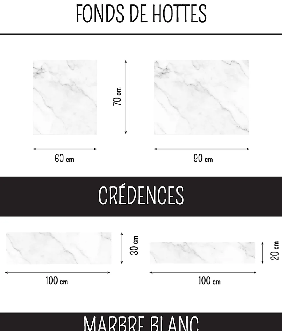 Une décoration tendance avec cette crédence prête à poser dans le style marbre déco, idéale pour s’harmoniser avec une cuisine en bois.Couleurs : Blanc effet marbre. Crédence de cuisine 100 cm x 20 cm, en Aluminium composite d’une épaisseur de 3 mm.Résistant à la chaleur et au feu (norme M1) compatible avec une plaque de cuisson électrique ou gaz, étanche, convient aussi pour votre cuisine d’été en extérieur. 100 % Recyclable.Le motif est imprimé directement sur la plaque d’aluminium en haute définition, et protégé par un film vernis en finition mat satiné anti UV.La pose est facile, des adhésifs doubles faces sont préinstallés au verso du fond de hotte.La pose est rapide sur le support existant (placo, peinture, carrelage, bois…) préalablement nettoyé et dépoussiéré.Dans le cas d’une découpe, c’est facile avec une scie sauteuse (lame métaux), ou une scie cloche pour l’emplacement d’une prise électrique.Pour parfaire l’installation, nous conseillons de poser un joint silicone entre la crédence et le plan de travail de votre cuisine, afin d’assurer une étanchéité parfaite.Pour le nettoyage et l’entretien de votre crédence de cuisine, une éponge et de l’eau savonneuse suffisent. (pas de détergents, ni d’éponge abrasive).Vous pouvez retrouver ce modèle dans des tailles différentes.Fabriqué en France.
