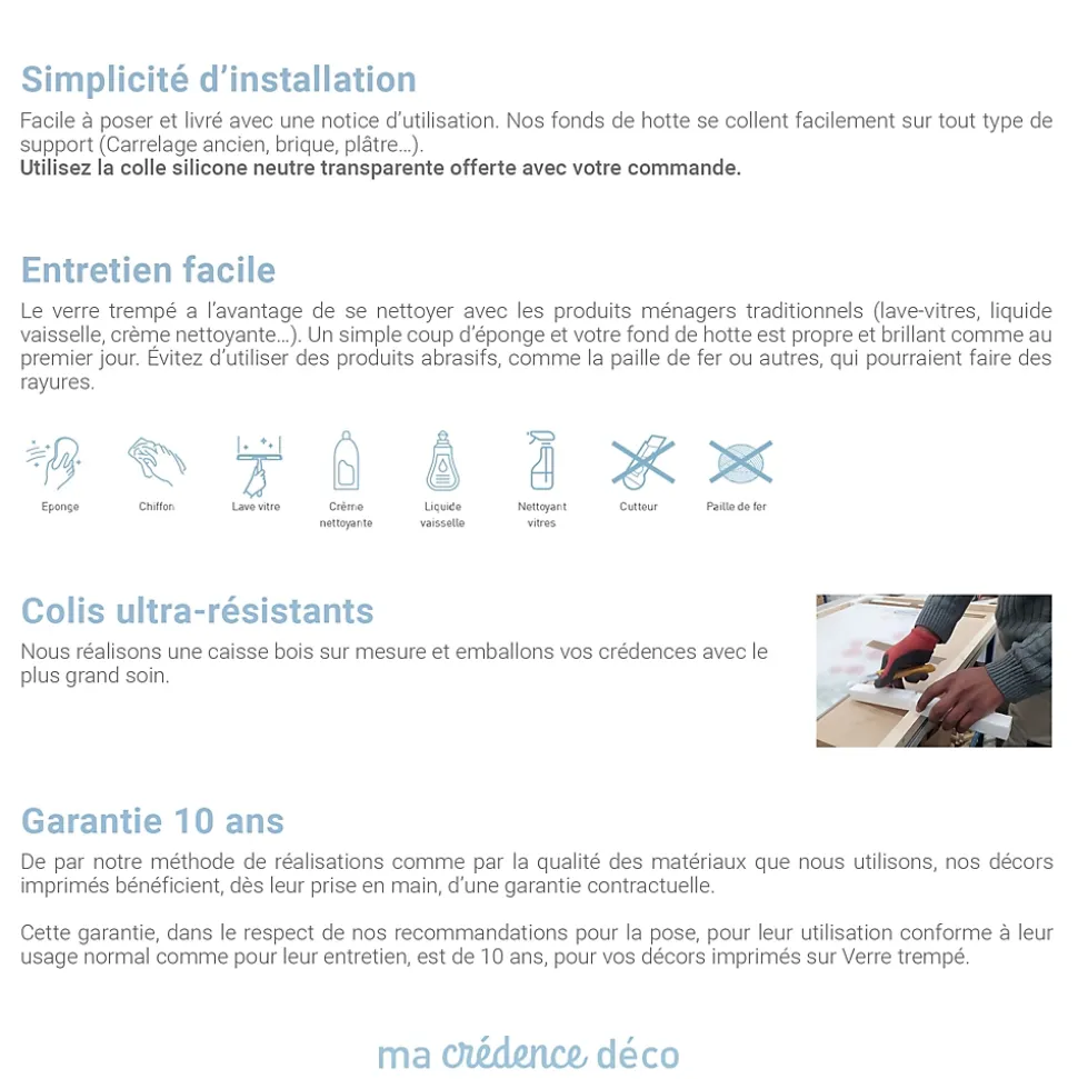 - Simplicité de pose : Nos crédences se posent facilement sur tout type de support (ancien carrelage, brique, plâtre…). Deux types de pose sont possibles : Collage silicone transparente (utilisée dans le bâtiment et disponible dans les magasins de bricolage) : simple et rapide, Vis : adapté aux surfaces non planes.