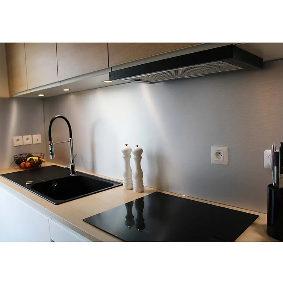 PRÉSENTATION DE LA CRÉDENCE ALUMINIUM BI-FACE AVEC PROFILÉS DE FINITIONApportez une finition moderne et professionnelle à votre cuisine avec cette crédence aluminium bi-face en aluminium brossé et aluminium brut.Décorative et protectrice, elle protège efficacement vos murs contre les projections d’eau, de graisse et les éclaboussures de cuisson.Vendue avec 3 profilés en U de finition en aluminium (2050 mm x 3 mm), elle assure un rendu propre, net et parfaitement encadré.CONTENU DU LOT• 1 crédence aluminium composite• 3 profilés de finition en U aluminium (2050 mm x 3 mm)CARACTÉRISTIQUES TECHNIQUES• Crédence aluminium composite bi-face : aluminium brossé / aluminium brut• Épaisseur : 3 mm• Formats disponibles : 100 x 50 cm et 200 x 100 cm• Structure : 2 feuilles aluminium + noyau polyéthylène• Léger, rigide et résistant aux chocs• Résistant à l’humidité• Résistance thermique limitée à 100 °CAPPLICATIONSIdéal pour crédence de cuisine, protection murale derrière plaques de cuisson, évier ou plan de travail.Convient également pour salle de bain, buanderie ou habillage mural décoratif.Alternative moderne aux crédences inox et verre trempé.MISE EN ŒUVRE SIMPLE• Se colle avec colle à métaux ou colle universelle• Se perce avec foret adapté aluminium/plastique• Se visse ou se boulonne• Se découpe facilement à la scie circulaire• Compatible avec supports : plâtre, brique, carrelage, béton• Lunettes de protection obligatoires lors de la découpeINFORMATIONS IMPORTANTES⚠ Le brossage du format 2000 x 1000 mm n’est pas identique à celui du 1000 x 500 mm.Pour un rendu homogène, privilégier un seul format pour un même projet.⚠ La face aluminium brut peut présenter de légères rayures liées au procédé de fabrication.⚠ Résistance à la chaleur limitée à 100 °C : maintenir une distance suffisante des feux à gaz.VIDÉO DE POSE