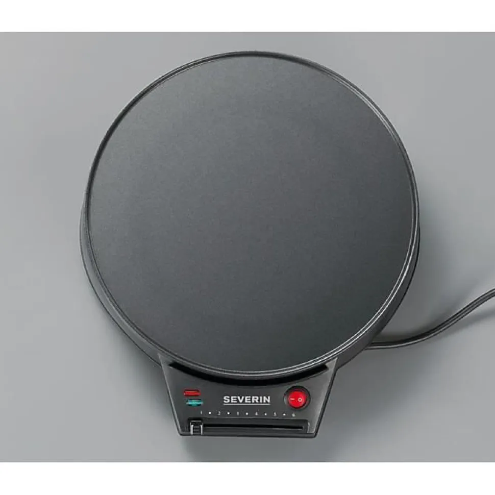 Crêpière 1000w 30cm Severin – – Puissance 1000 WSocle en matière plastique de qualité supérieurePlaque de cuisson anti-adhésive, Ø 30 cmThermostat réglableInterrupteur marche-arrêt avec voyant lumineux de contrôleTémoin prêt à l’emploiSpatule à crêpes et répartiteur de pâte en boisRangement de cordonVentouses anti-glisseDimensions : 30,5 x 35,5 x 8 cmPoids : 1,9 kg