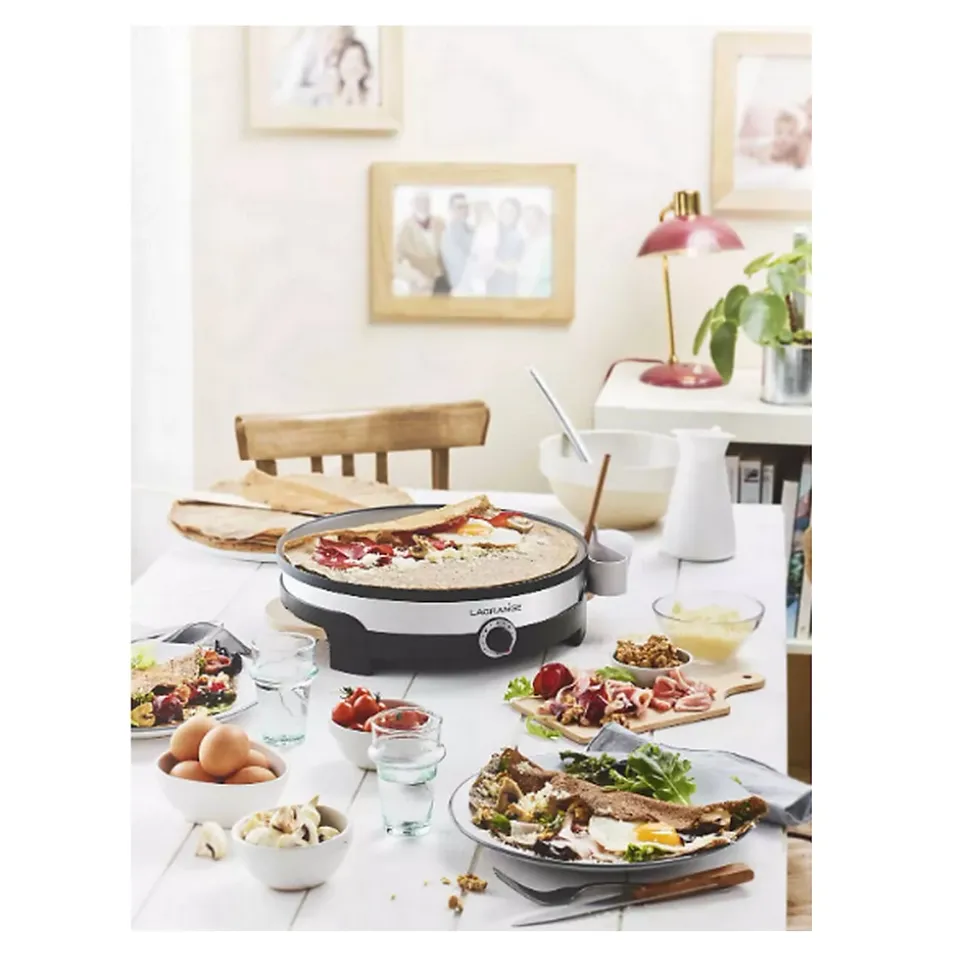 Crêpière 1500w 35cm noir/gris Lagrange – Crêpière Tradi’Duo 109018 de Lagrange.Pour réaliser une grande crêpe de 35 cm ou 4 petites crêpes !Produit conçu et assemblé en France.Facile à utiliser : puissante (1500W), thermostat réglable, large plaque de 35cm de diamètre en fonte d’aluminium et accessoires malins.Facile à transporter : poignées en bois intégrées.Thermostat réglable : 5 positions de thermostat pour ajuster la température de la plaque ou maintenir au chaud.Accessoires inclus : les accessoires indispensables pour réussir les crêpes : une grande louche, un répartiteur, une grande spatule, 4 petites spatules et un rince répartiteur.Multifonctions / pochoir petites crêpes : réaliser des petites crêpes de 14cm de diam. grâce à un pochoir en silicone.Facile à nettoyer : plaque amovible avec revêtement antiadhésif. – Type de produit : Crêpière.Gamme : Tradi’Duo.Type de crêpes : Crêpes normales et mini crêpes.Puissance (W) : 1500.Nbre personnes : 4.Thermostat réglable : Oui.Nombre de positions : 5Nombre de plaques : 1.Pochoir silicone : 4 mini crêpes (ø 14cm).Matière du socle : Thermoplastique.Poignées en bois verni.1 grande louche, 1 répartiteur, 1 grande spatule, 4 petites spatules et un rince répartiteur.Thermostat réglable.Voyant lumineux.Cordon amovible de 2m.Plaque amovible.Matière de la plaque : Fonte d’aluminium avec revêtement antiadhésif.Répartiteur : Oui.Grande spatule : Oui.Mini spatule(s) : 4.Louche doseuse : Oui.Couleur : Noir.Couleur(s) secondaire(s) : Gris.Diamètre de la plaque (cm) : 35.Dimensions L x P x H (cm) : 39 x 39 x 12.Poids net (kg) : 3.18.