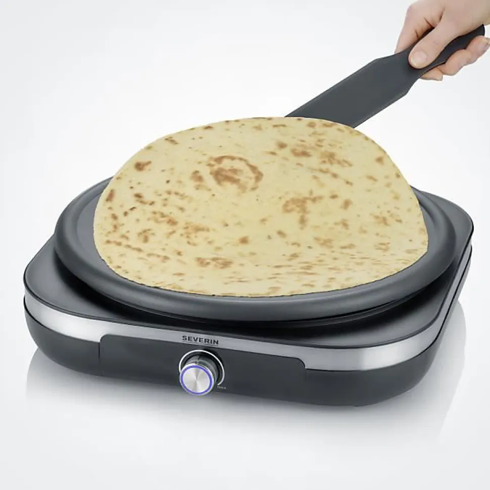 Préparez des crêpes et galettes XXL avec la crêpière SEVERIN de 1500 W. Sa plaque amovible antiadhésive et son thermostat à voyant lumineux (rouge : en chauffe, bleu : prêt) garantissent une utilisation facile. Inclus : spatule et répartiteur de pâte antirayure.