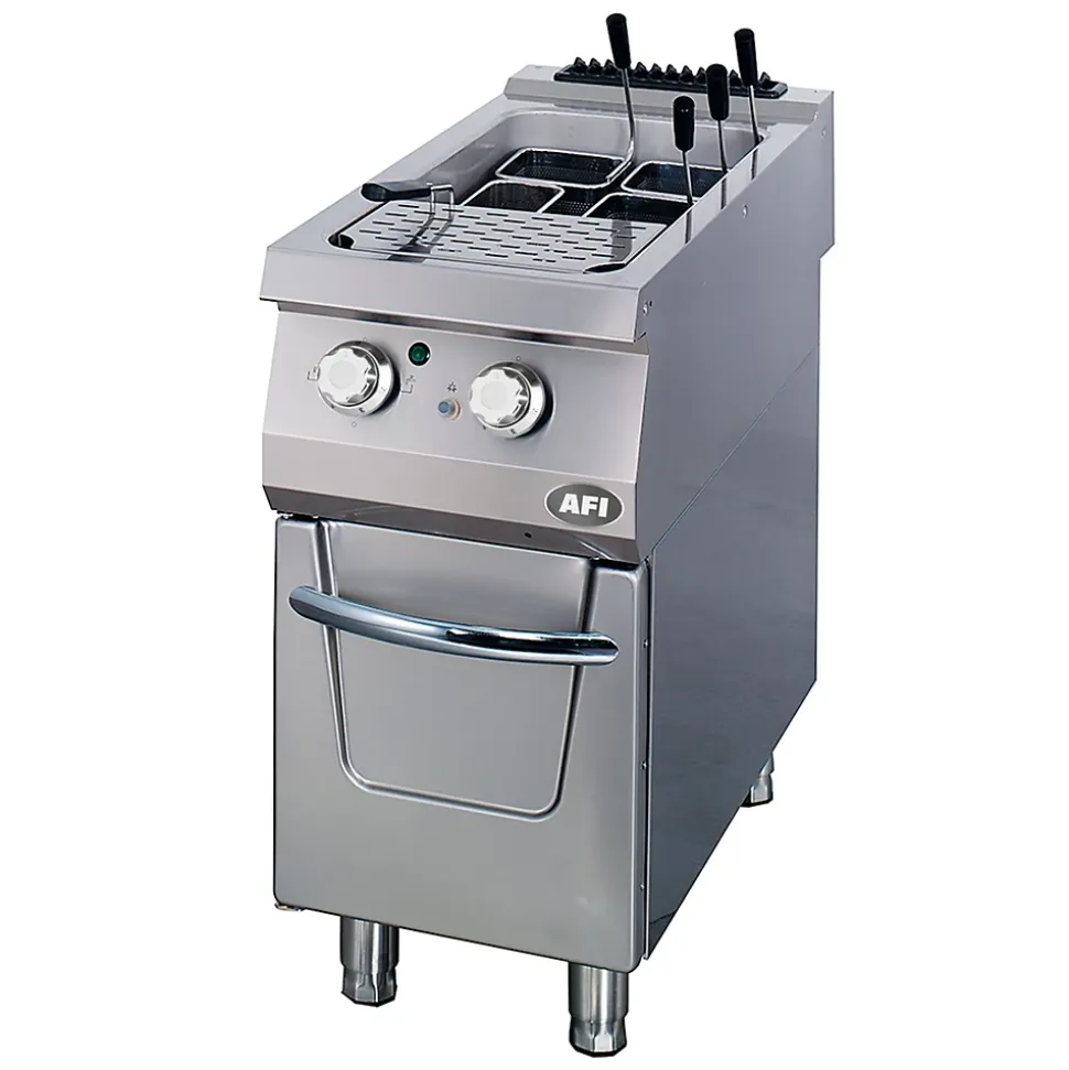 AFI Collin-Lucy cuiseur. AFI Collin-Lucy cuiseur. Cuiseur à pâte électrique de la marque AFI Collin Lucy, fabriqué en inox de haute qualité. Il dispose d’un cuve de 40 litres emboutie en inox 304 AISI d’une seule pièce sans soudure pour un nettoyage plus facile, une meilleure hygiène et une durée de vie accrue. La cuve et la partie supérieure de l’appareil forment un dessus monobloc grâce à un assemblage spécifique Large plage avant d’égouttage pour chaque cuve Fonctionnement automatisé pour conserver la meilleure qualité d’eau de cuisson possible Appareil équipé de robinets eau chaude/eau froide pour le remplissage rapide et direct des cuves Robinet de vidange avec valve de sécurité pour vider rapidement et sans danger chaque cuve de l’appareil les résistances blindées assurent une montée en température rapidePaniers non fournisVolume (litres) : 40Puissance (kW) : 12Tension et voltage : Tri 400 VLargeur: 400 mmProfondeur: 900 mmHauteur: 850 mm. l40- L0.1- P90- h85-