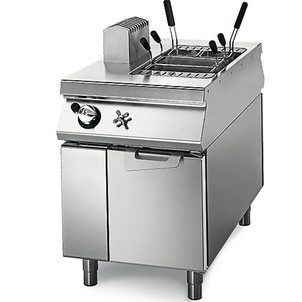Cuiseur à pâtes gaz sur coffre avec portes – Virtus Cuiseur à pâtes gaz sur coffre avec portes de la marque Virtus, fabriqué en acier inoxydable de haute qualité.Plan de travail en AISI 304, épaisseur 20/10. Bassin GN 1/1 en acier inoxydable AISI 316.Remplissage d’eau par robinet sur le panneau de commande.Brûleur sous le bassin. Alimentation en gaz par robinet de sécurité avec thermocouple, allumage piézoélectrique automatique.Taille (mm): L600 P1100 H870Poids (Kg): 92.00Puissance: gazPuissance (Kw): 11,800Capacité: 1x GN 1/1Entrée d’eau 3/4″Raccordement au gaz 1/2″