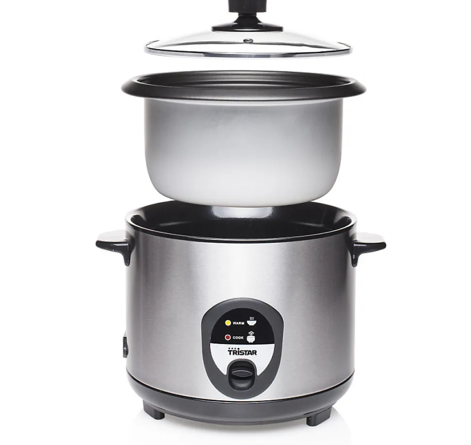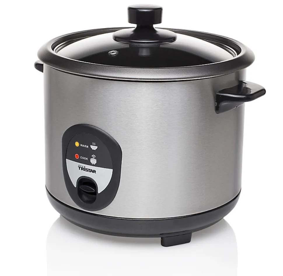 Cuiseur à riz 1.5l 500w inox Tristar – Cuiseur à riz RK-6127 Tristar. Capacité 1,5L – Corps inoxLe riz est parfaitement cuit en un temps record. Il s’éteint automatiquement lorsque le riz est prêt. Grâce à sa fonction de maintien au chaud, le riz reste chaud et savoureux durant des heures. – Capacité: 1.5 L.Convient pour 7 tasses.Cuve avec revêtement antiadhésif.Panier amovible.Fonction de maintien au chaud.Arrêt automatique en cas de fonctionnement à sec.Cuillère.Verre doseur.Spatule.Pieds anti-dérapants.Témoins lumineux de fonctionnement.Puissance : 500 W.Cuve amovible : Oui.Spatule : Oui.Poignée(s) : Oui.Fonction garder au chaud : Oui.Matériau du boîtier/corps : Acier inoxydable.Profondeur : 22 cm.Hauteur : 26,5 cm.Poids : 2,06 kg.Largeur : 26,5 cm.Poids du paquet : 2,44 kg.Couleur : Noir, Acier inoxydable.