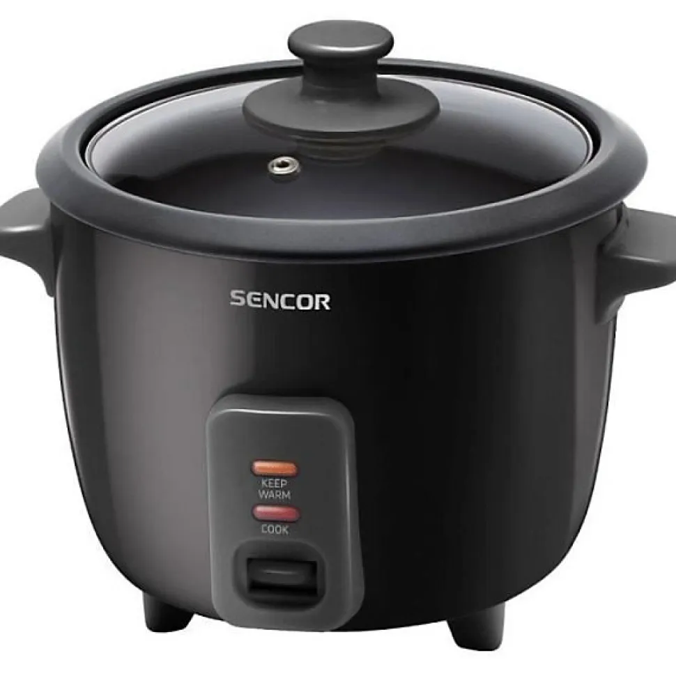 Cuiseur à riz électrique SENCOR SRM 0601BK, 300 W, 0,6 L. Fonctionnement entièrement automatisé avec maintien au chaud jusqu’à 6 heures. Couvercle en verre, poignées latérales, pieds antidérapants et revêtement acier inoxydable. Accessoires inclus : spatule spéciale riz et verre doseur. Dimensions compactes, idéal pour portions individuelles.