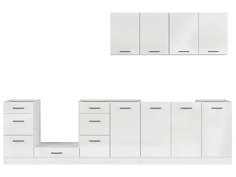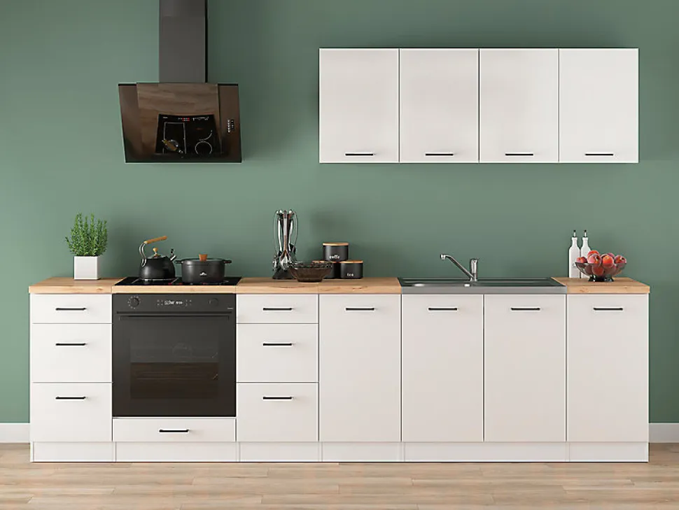 Ensemble de meuble de cuisine d’une longueur de 300 cm comprend à la fois des armoires basses de cuisine et des armoires suspendues de cuisine afin d’offrir une solution de rangement complète. Cet ensemble contient tous les éléments nécessaires pour une cuisine fonctionnelle et bien organisée.Dimension des meubles bas : Profondeur 47 x Hauteur 82,5 cmDimension des meubles hauts : Profondeur 30,5 x Hauteur 57,5 cmCouleur : Blanc/Craie brillantStructure et façade : panneaux de particules , MDFPoids : 138 kgAccessoires : charnières Hettich, poignée en plastique, glissièresPlan de travail, évier robinetterie , Appareils électroménagers non inclus