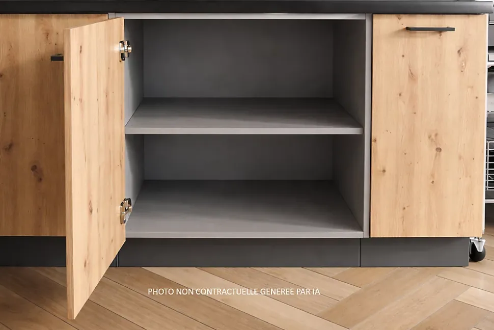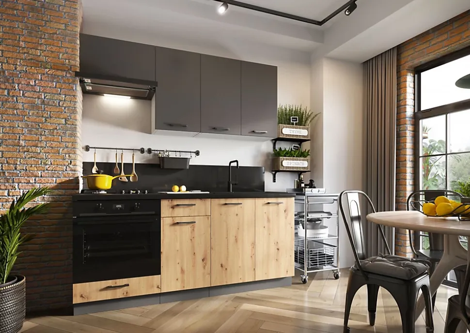 Cuisine moderne au style industriel, alliant la couleur du bois naturel et une finition foncée mate pour un rendu chaleureux et contemporain.Les meubles bas sont dotés de façades en couleur bois clair avec veinage apparent, offrant un aspect authentique et robuste. Ils sont équipés de poignées noires minimalistes, assurant une ouverture pratique et un design épuré.Les meubles hauts, de coloris gris anthracite mat, apportent une touche moderne et contrastée. Leur ligne droite et leur finition lisse offrent un espace de rangement généreux tout en conservant une esthétique sobre.Les matériaux robustes et la conception fonctionnelle font de cette cuisine un espace à la fois pratique, durable et esthétique, parfaitement adapté à un intérieur moderne ou loft.Cuisine composée de 6 meubles. Dim 1m80. Haut gris foncé mat et bas chêne clair mat. Façades en panneaux de particules et poignées plastiques noires. Fourni sans plan de travail ni évier ni mitigeur ni électroménager. 3 meubles hauts et 3 meubles bas. Fabrication et normes CE.