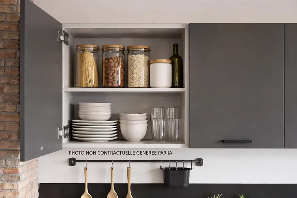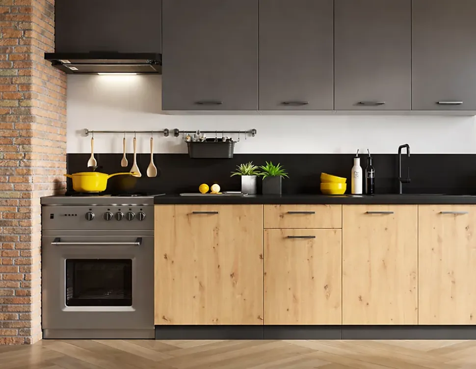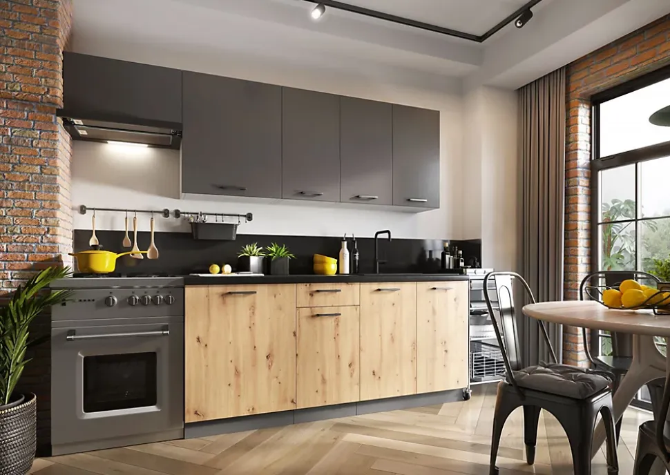 Cuisine de style moderne–industriel, où l’association de la couleur du bois naturel et des surfaces gris mat est très réussie, et créant un espace fonctionnel, chaleureux et très actuel.Meubles hauts :- Placards muraux lisses et sans moulures, de style contemporain- Finition gris mat- Poignées fines et droites en métal sombre, intégrées discrètement- Alignement horizontal, apportant une esthétique épuréeMeubles bas :- Façades de la couleur du bois, avec imitation d’un veinage naturel visible- Aspect chaleureux contrastant avec les meubles hauts gris- Poignées assorties aux meubles hauts (métal sombre)- Intègrent meubles avec portes et tiroirsCuisine composée de 7 meubles. Dim haut 2m40 et bas 1m80 (+ place de 60cm pour la cuisinière). Haut gris foncé mat et bas chêne clair mat. Façades en panneaux de particules et poignées plastiques noires. Fourni sans plan de travail ni évier ni mitigeur ni électroménagers. Fabrication et normes CE.