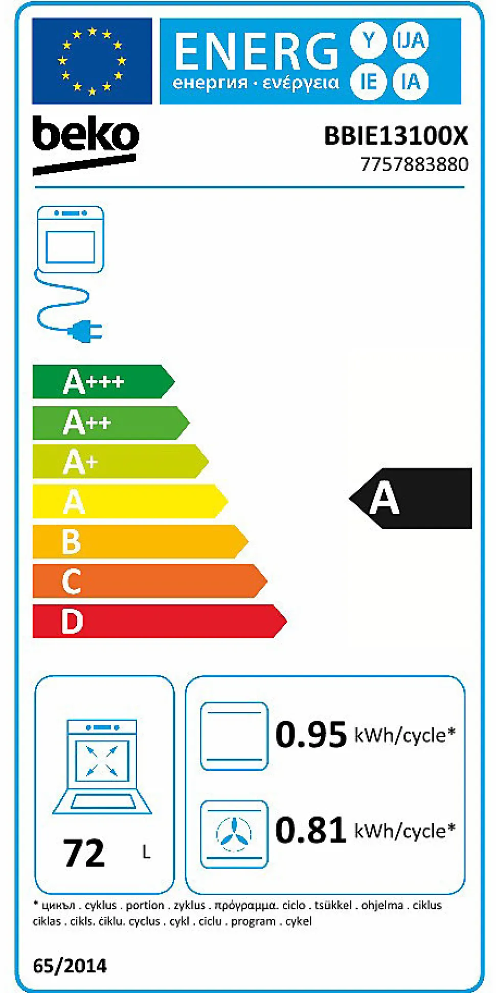 - Électroménager Beko inclus : Réfrigérateur/congélateur 176 L + 44 L. 37 dB. Classe E. / Four électrique 75 L multifonctions avec ventilation, classe A. / Plaque vitrocéramique 1,2 kW … 1,8 kW. 4 foyers. / Hotte : Déco élec. Filtre à charbon. 1 lampe 28 W, classe C