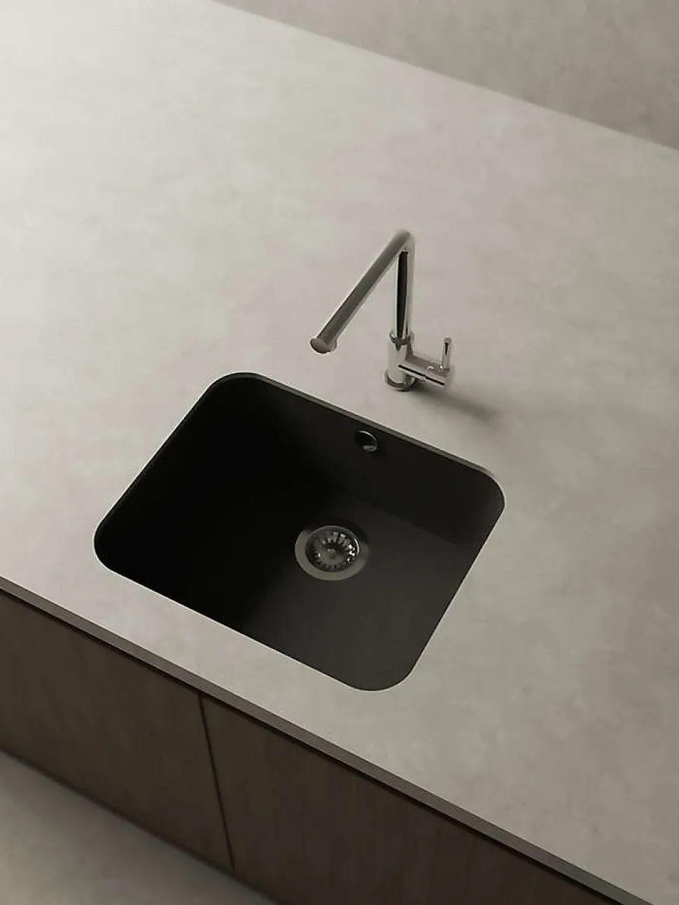 Evier à installation sous plan avec une cuveRésistance aux rayures, à l’abrasion, à la chaleur (185°C), aux agents chimiques et aux colorants selon les tests UNE-EN 13310 -> Sans altérationLivré avec bonde manuelle ronde, siphon, colle mastic et barre de soutien.