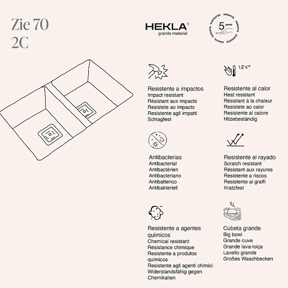« POALGI : fabricant espagnol depuis 1989 d’éviers et de receveurs de douche haut de gamme et de qualité pour les professionnels du sanitaire et les particuliers. Société certifiée ISO9001.La collection ZieSophistication et modernité, l’évier Zie est un chant à la discrétion. La synthèse d’un nouveau style de cuisine basé sur des lignes pures, l’exemption du superflu et l’intégration de ses éléments. Conçu pour se fondre dans le plan de travail grâce à sa forme, Zie est pur minimalisme.Le matériau HeklaHekla est le nouveau matériau de masse de Poalgi. Un matériau pour résister au passage du temps créé par un projet de recherche et développement dirigé par notre équipe ambitieuse, et approuvé par l’Institut Technologique AIDIMME. Inspiré par la bravoure des volcans, Hekla est un matériau compact composé de charges minérales dans différentes granulométries qui, avec la résine technique ajoutée, enveloppent chaque particule en obtenant un matériau unique et résistant. La technologie de dernière génération utilisée dans la fabrication des produits Hekla garantit la résistance à la charge, les dommages d’impact et les effets des températures élevées et basses, ainsi que la sécurité du transport, de l’installation et de l’utilisation quotidienne. Son traitement de surface empêche l’apparition de bactéries et son traitement V (anti-vieillissement) rend chaque produit Hekla en un véritable survivant au passage du temps.Le revêtement BactiblockCe procédé est un additif antimicrobien idéal pour une large variété de matériaux polymères. La technologie brevetée par la société NBM repose sur de l’argile fonctionnalisée avec de l’argent, laquelle va se comporter comme une source naturelle hautement efficace comme agent microbien. Cet additif inhibe le développement des bactéries de type champignon et levure, se convertissant ainsi en une solution efficace contre les odeurs et les tâches. »
