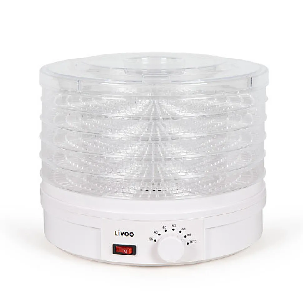 Déshydrateur LIVOO DOM202 blanc, puissance 245 W, 5 plateaux amovibles, thermostat réglable, système de ventilation pour une répartition uniforme de la chaleur, capacité 13,5 litres, dimensions 33,2 cm diamètre x 25 cm hauteur, poids 2,43 kg.