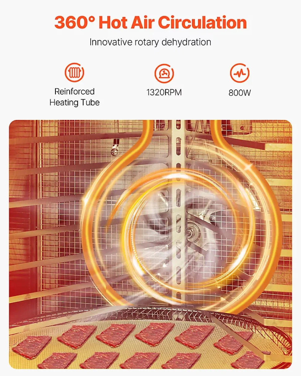 Présentation du produitDéshydrateur alimentaire à 12 plateauxUn déshydrateur alimentaire très efficace, sain et pratique pour sécher les fruits et légumes. Contrairement au séchage au soleil traditionnel, l’utilisation d’un déshydrateur alimentaire assure la propreté et l’hygiène, avec un contrôle de la température pour sécher les aliments à tout moment, indépendamment des conditions météorologiques.SpécificationNuméro du modèle de l’article : H12-CX001Puissance nominale : 800 WCapacité : 45,5 LNombre de plateaux : 12Taille du plateau : 11,81 x 11,81 pouces / 30 x 30 cm (plateau rond)Vitesse à vide du moteur : 1320 tr/minPoids net : 26,9 lb / 12,2 kgDimensions du produit (L x l x H) : 355 x 473 x 495 mmContenu du coffret1 x machine à déshydrater les aliments12 x plateaux de séchage1 x cordon d’alimentation1 x poignée (avec 2 vis, 4*8 vis à tête fraisée)1 x bac d’égouttage1 x Recette12 x feuilles de maille2 x Rouleaux de fruits (silicone)1 x gants1 x Manuel d’utilisationCaractéristiques et détailsDéshydratation rotative : la déshydratation rotative innovante, les deux ventilateurs et la conception du flux d’air en circulation assurent une distribution uniforme de la chaleur et du flux d’air. Ce déshydrateur alimentaire sèche même divers ingrédients tout en préservant les nutriments sans pertePlateaux ronds en acier inoxydable 304 : le déshydrateur de viande de bœuf séchée est livré avec douze plateaux en acier inoxydable 304 (11,81 x 11,81 pouces / 30 x 30 cm) pour un contact direct avec les aliments en toute tranquillité. Ces plateaux durables offrent un excellent support de poids, avec une conception qui les empêche de tomberGrande capacité à 12 couches : ce grand déshydrateur peut contenir jusqu’à douze couches de nourriture à la fois, séchant de grandes quantités d’ingrédients en une