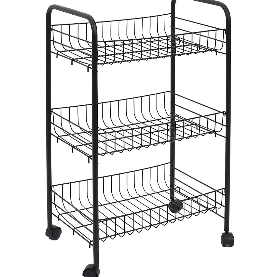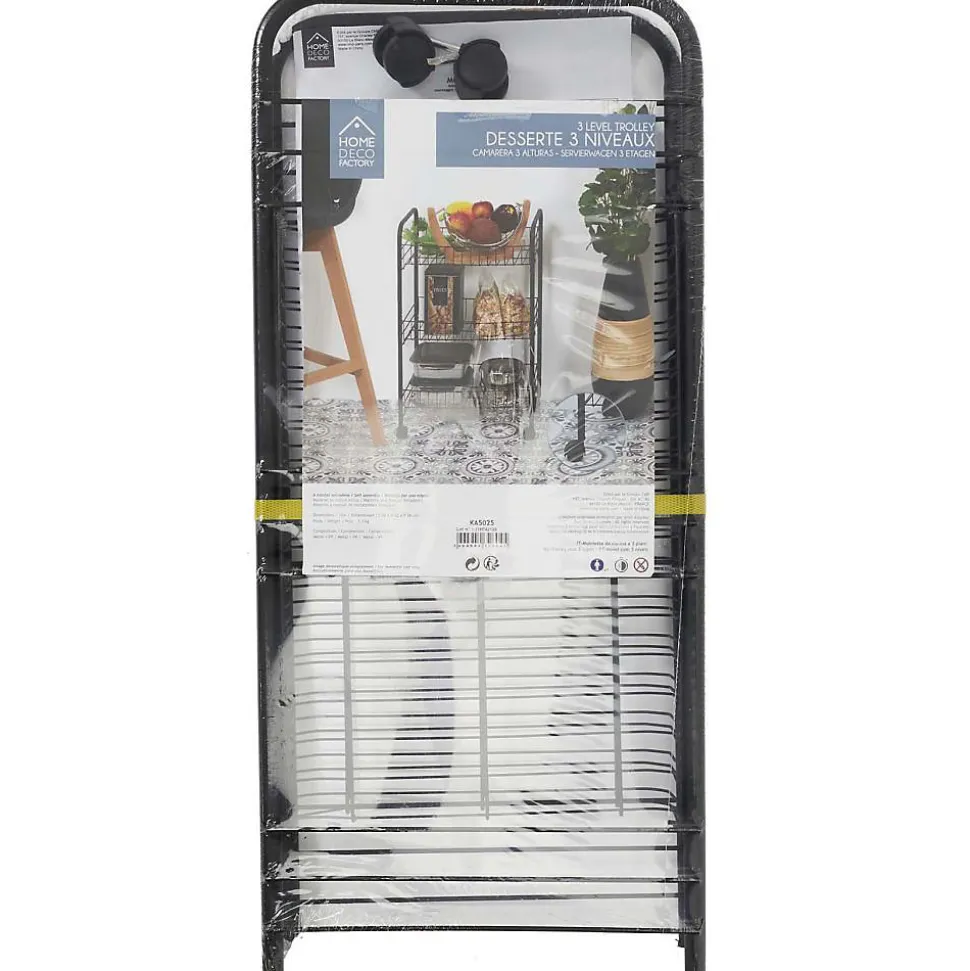 Aspect : Coloris = Noir • Matériau principal = Fer • Matériaux secondaires = Polypropylène • Dimensions : Hauteur (en cm) = 62 • Longueur (en cm) = 40 • Profondeur (en cm) = 26 • Autres caractéristiques : Informations complémentaires = 4 roulettes – 3 niveaux • Poids (en kg) = 1,20 • Desserte 3 niveaux en métal noir 62 x 26 x 40 cm
