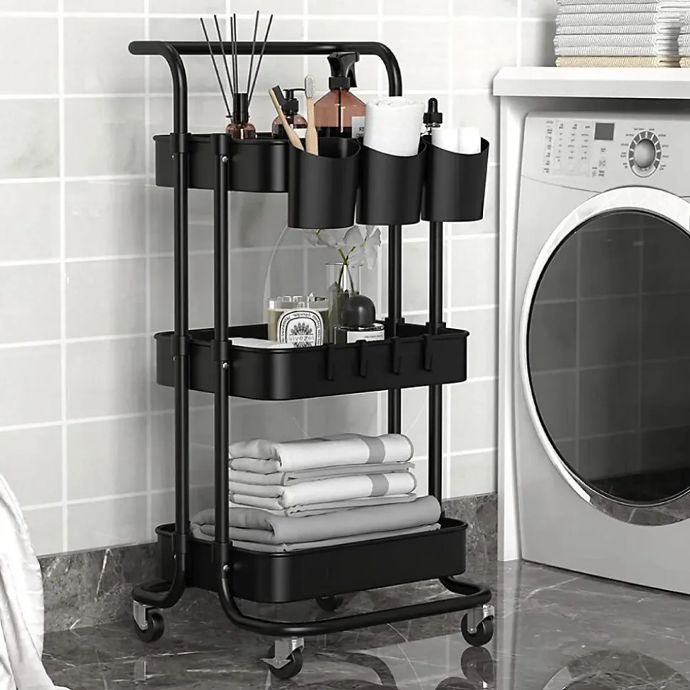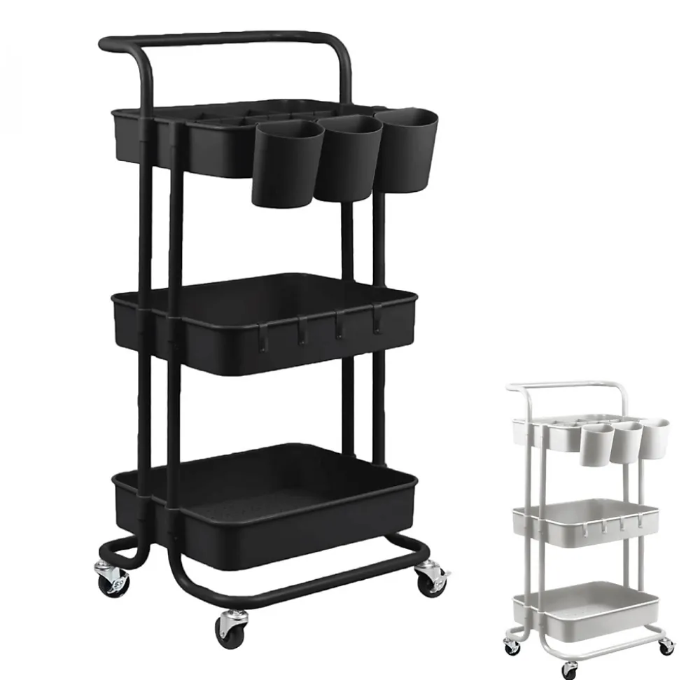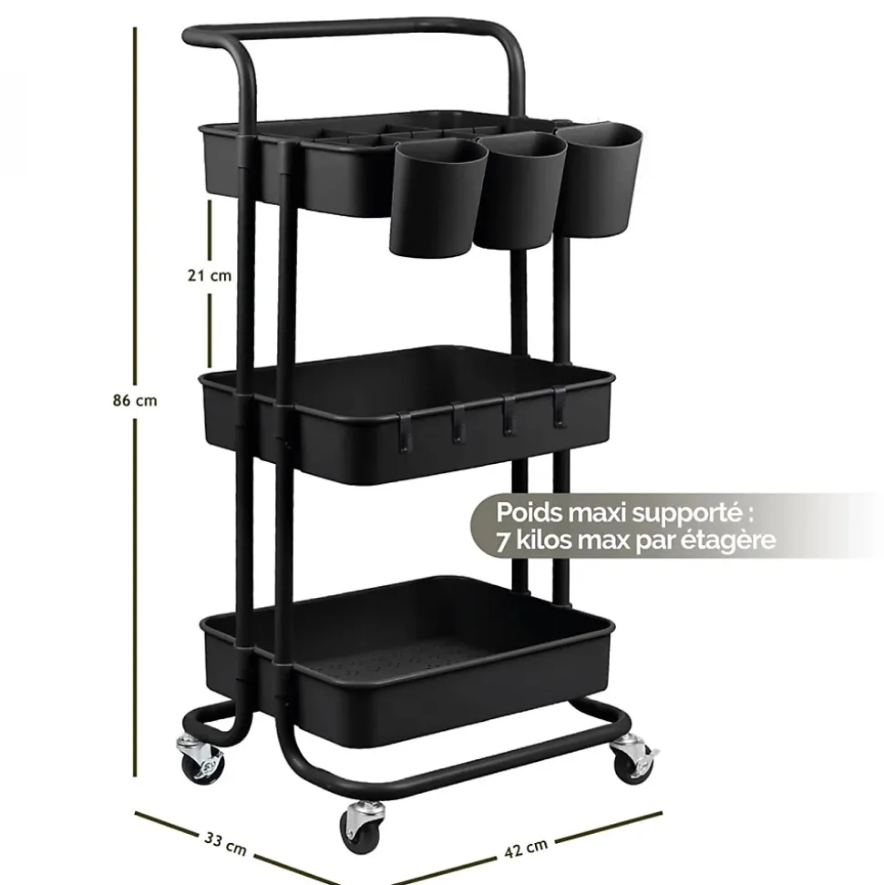 Le chariot de rangement avec poignée Vivezen va devenir votre allié du quotidien, il dispose en effet de 3 étagères permettant d’optimiser au maximum l’espace dans les moindres recoins. Disposant également de 3 paniers et 5 interstices de rangement, ce chariot est votre allié du quotidien.Fabriqué en ABS et en acier au carbone, ce chariot de rangement large 3 étagères est solide et résistant. Chaque étagère peut supporter jusqu’à 7 kilos, de quoi stocker largement.Ce chariot de rangement possède des roues pivotantes à 360° dont deux avec freins. Pesant moins de 4 kilos, ce chariot est facile à stocker et à transporter, il se glisse et se pousse facilement à l’aide de sa poignée.En seulement quelques minutes votre chariot de rangement avec poignée est monté et prêt à être utilisé, aucun outil est nécessaire. Le chariot mesure 86 cm de hauteur, 33 cm de profondeur et 42 cm de largeur.Disponible en plusieurs coloris.