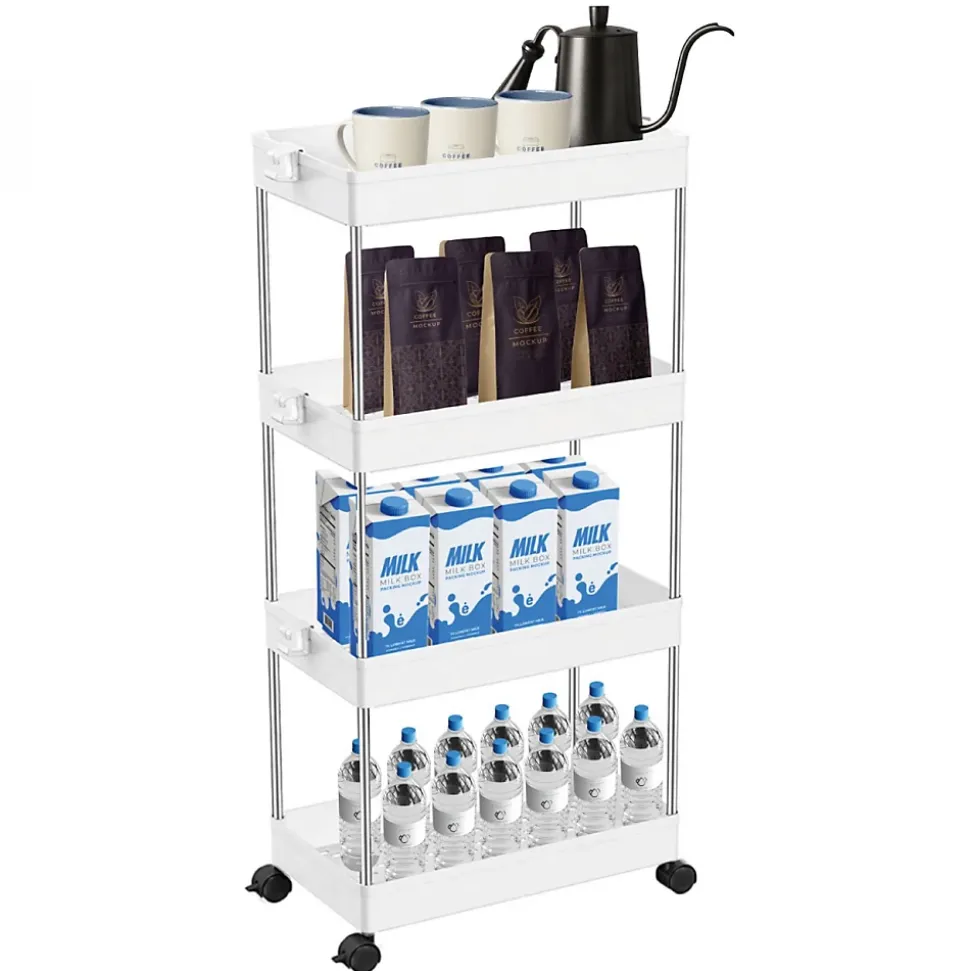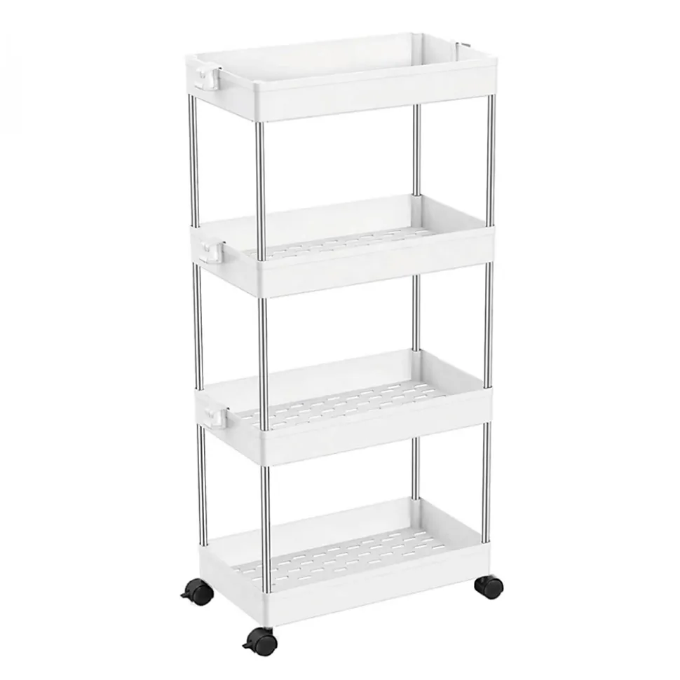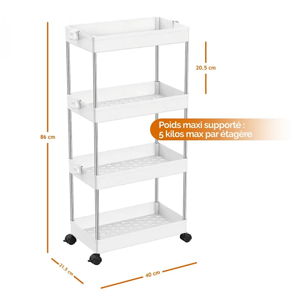 Le chariot de rangement large Linxor va devenir votre allié du quotidien, il dispose en effet de 4 étagères permettant d’optimiser au maximum l’espace dans les moindres recoins. Disposant également de 4 crochets de suspension pour encore plus de rangements, il deviendra vite indispensable.Fabriqué en plastique de haute qualité et avec une armature en acier inoxydable, ce chariot de rangement large 4 étagères est solide et résistant. Chaque étagère peut supporter jusqu’à 5 kilos, de quoi stocker largement.Ce chariot de rangement large possède des roues pivotantes à 360° dont deux avec freins. Pesant moins de 2 kilos, ce chariot est facile à stocker et à transporter, il se glisse facilement entre les placards, bureaux ou autres buanderies.En seulement quelques minutes votre chariot de rangement large est monté et prêt à être utilisé, aucun outil est nécessaire. Le chariot est de couleur blanche et mesure 86 cm de hauteur par 40 cm de largeur et 21.5 cm de profondeur.Autres coloris et tailles disponibles.