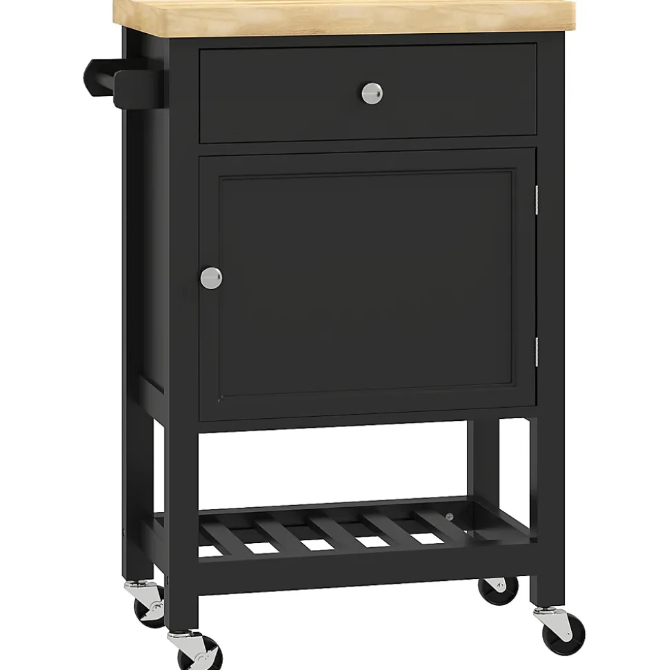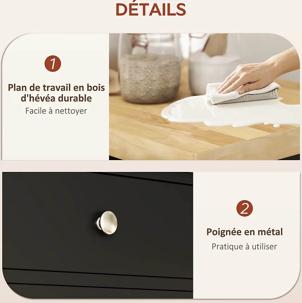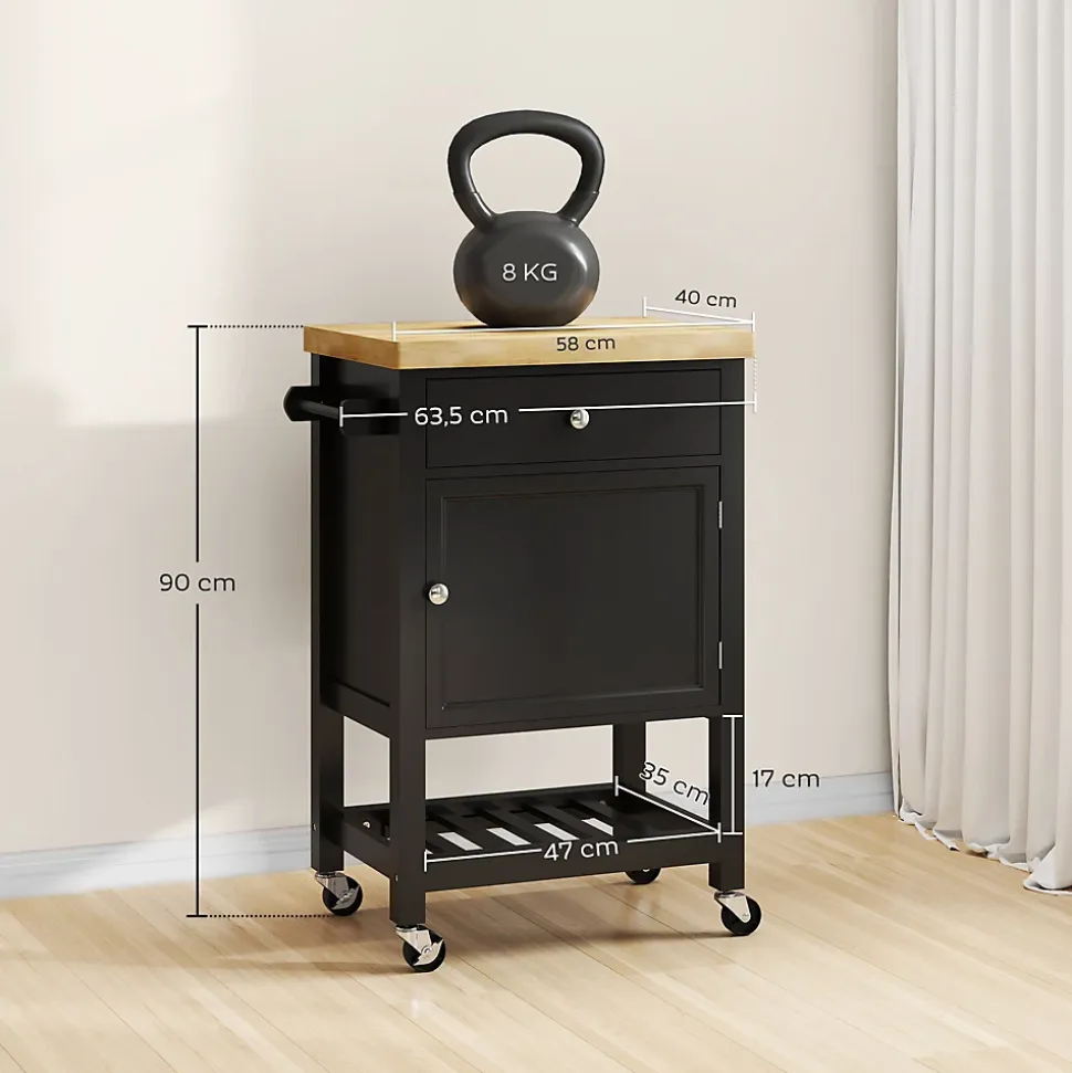 Besoin d’espace de rangement supplémentaire, mais pas la place pour un îlot central complet ? Ce chariot de cuisine à roulettes HOMCOM est un meuble de cuisine pratique. Il est équipé d’un tiroir, d’un placard et d’une étagère ouverte, offrant un espace de rangement pour les essentiels de cuisine et les produits secs. Le porte-serviettes intégré fait également office de poignée de transport pratique. Prenez le contrôle de votre cuisine grâce à cet îlot central transportable HOMCOM.Caractéristiques :- Design nordique avec plateau en bois de hévéa et poignées argentées, parfait pour desserte cuisine rangement; – Un tiroir, un meuble et une étagère ouverte offrent un espace de rangement pratique; – Plateau en bois de hévéa de 2,8 cm d’épaisseur, facile à nettoyer et robuste; – Desserte de cuisine à roulettes avec 4 roues pivotantes, dont 2 avec freins pour une mobilité sécurisée; – Dimensions compactes adaptées à la cuisine, salle à manger ou usage commercial; – Porte-serviettes de la desserte à roulettes fonctionnant également comme poignée pour un transport facile; – Montage nécessaireSpécifications :- Couleurs : noir, chêne- Matériaux : MDF, bois de caoutchouc- Dim. totales : 63,5l x 40P x 90H cm- Dim. du plan de travail : 58L x 40l x 2,8P cm- Dim. du tiroir : 42l x 28,5P x 6,5H cm (intérieures)- Dim. de l’armoire : 47l x 35,5P x 38,5H cm (intérieures)- Dim. de l’étagère inférieure : 47l x 35P x 17H cm- Charge max. recommandée : 40 kg (total), 8 kg (étagère), 5 kg (tiroir)- Réf. : 801-182V81BK