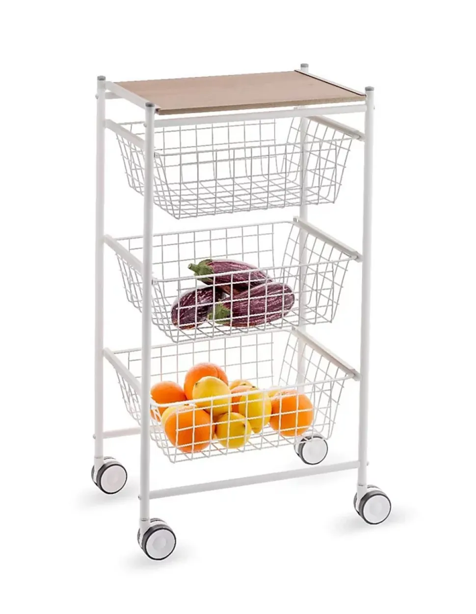 Vous cherchez un rangement supplémentaire pour la cuisine ou un petit meuble qui peut être déplacé entre la cuisine et le salon ? La desserte de cuisine AXO est la solution idéale grâce à son esthétique et à sa capacité de stockage.Design et fonctionnelle, la desserte AXO est pensée pour ceux qui recherchent un espace organisé et visuellement harmonieux.Principales caractéristiques:Structure tubulaire et profilés en acier renforcé qui confèrent au meuble stabilité et robustesse.Structure métallique thermolaquée blanche se distingue par ses lignes épurées et son aspect homogène. La peinture poudre polyester souligne son design avec une finition élégante et harmonieuse.Panneau de particules recouvert d’un double stratifié mélaminé. 3 paniers en acier de grande capacité, entièrement amovibles et aux périmètres renforcés. La conception des trous dans les paniers permet une ventilation adéquate des fruits et légumes pour une meilleure conservation. Plan de travail de couleur hêtre. Avec cette étagère supérieure, vous disposez d’une surface de travail supplémentaire. 4 roues avec des composants anti-usure qui permettent de déplacer facilement le chariot dans la cuisine ou dans n’importe quelle pièce de la maison. Combinaison de métal et de bois. Son esthétique et sa distribution en font un meuble auxiliaire pratique également pour d’autres espaces de la maison comme le salon, les chambres à coucher et même les salles de bains.Le meuble est livré démonté. Montage rapide et facile grâce aux instructions de montage incluses. Nettoyage facile : utilisez un chiffon légèrement humide. Fabrication espagnole, privilégiant l’économie durable de proximité.Desserte de cuisine AXO – Rangement, qualité et capacité au meilleur prix.
