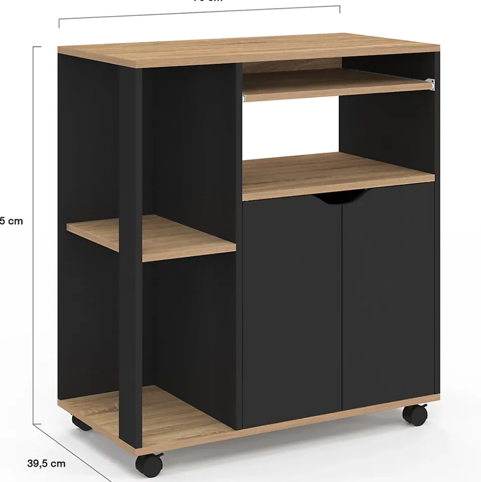 Voilà le meuble parfait pour l’optimisation de votre espace ! Organisez votre cuisine comme vous le rêviez grâce à votre nouvelle desserte. Quoi de plus tendance que le mélange noir et bois ? La desserte de cuisine COSI vous offre de nombreux rangements ! Stockez vos huiles, vinaigres, épices et bouteilles dans les deux rangements latéraux prévus à cet effet. Ses 4 roulettes, dont 2 avec frein, vous permettent de déplacer la desserte à votre guise tout en gardant à portée de main vos condiments pendant que vous cuisinez.Derrière les portes noires ultra-design de votre meuble, se cachent encore un large rangement ! Empilez toute votre vaisselle, torchons, conserves ou produits d’entretien dans cet espace fermé, très pratique pour dissimuler votre petit bazar de cuisine. Ses multifonctions ne s’arrêtent pas là ! Juste au-dessus du placard, vous trouverez une grande niche de rangement, idéal pour y entreposer vos denrées périssables.Ce meuble possède également un large plateau ainsi qu’une tablette coulissante que vous pouvez utiliser pour cuisiner ou continuer votre rangement. Outre toutes les solutions de rangement proposées, cette desserte de cuisine apporte une touche élégante et moderne à votre cuisine grâce à son côté bicolore noir et bois. Besoin de gagner de l’espace dans votre cuisine ? Laissez-vous séduire par cette desserte roulante, ultra design et fonctionnelle, qui ravivera votre déco intérieure en un tour de main !Dimensions de la desserte bois noir et plateaux façon hêtre- Dimensions totales : Longueur 76 cm x Profondeur 39,5 cm x Hauteur 85 cm- Dimensions du placard fermé : L. 53 x P. 39,5 x H.51 cm- Dimensions des étagères de gauche : L.23 x H. 40 cm- Dimensions des portes façon hêtre : L. 24,5 x H. 48 cm- Dimensions du plateau coulissant sur rail : L. 53 x P. 35 x H. 70 cm- 4 roulettes dont 2 avec frein, Hauteur au-dessus du sol : 5 cm- Panneaux de particules 15 mm, 12 mm au niveau des portes- Fond de placard en MDF de 2 mm- Coloris : bois noir et pl