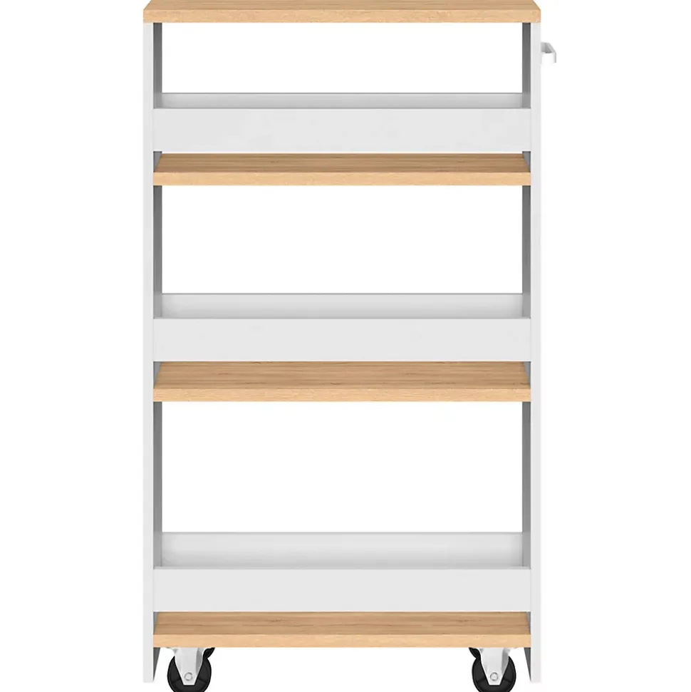 Optimisez le stockage de votre cuisine en y intégrant la desserte à roulettes HAGA gain de place ! Ordonnez vos denrées sur les 3 espaces de la desserte. L’espace le plus bas, de 27,5 cm de hauteur est idéal pour ranger vos huiles, vinaigres et petites bouteilles.Placez vos épices et condiments sur les deux autres étagères de 24 et 17,7 cm de hauteur. Chaque espace de stockage est sécurisé par des renforts latéraux pour assurer la stabilité de votre rangement. Avec ses 16 cm de largeur, glissez le range-épices entre votre cuisine et votre frigidaire, pour un espace de stockage optimisé. Faites coulisser le range-épices en toute facilité, comme un élément de cuisine à part entière, tirez pour accéder à son stockage et poussez pour occulter son stockage. Plus d’hésitation, ajoutez du rangement à votre cuisine à petit prix ! Dimensions de la desserte de cuisine gain de place HAGADimensions globales : Longueur 47 x largeur 16 x Hauteur 80 cmDimensions des étagères du bas vers le haut : H. 27,5 cm – 24 cm – 17,7 cm4 roues Matériaux : Panneaux de particules et MDF Coloris : Blanc et façon hêtreÀ monter soi-mêmeRetrouvez l’ensemble de nos dessertes de cuisine sur notre boutique en ligne !